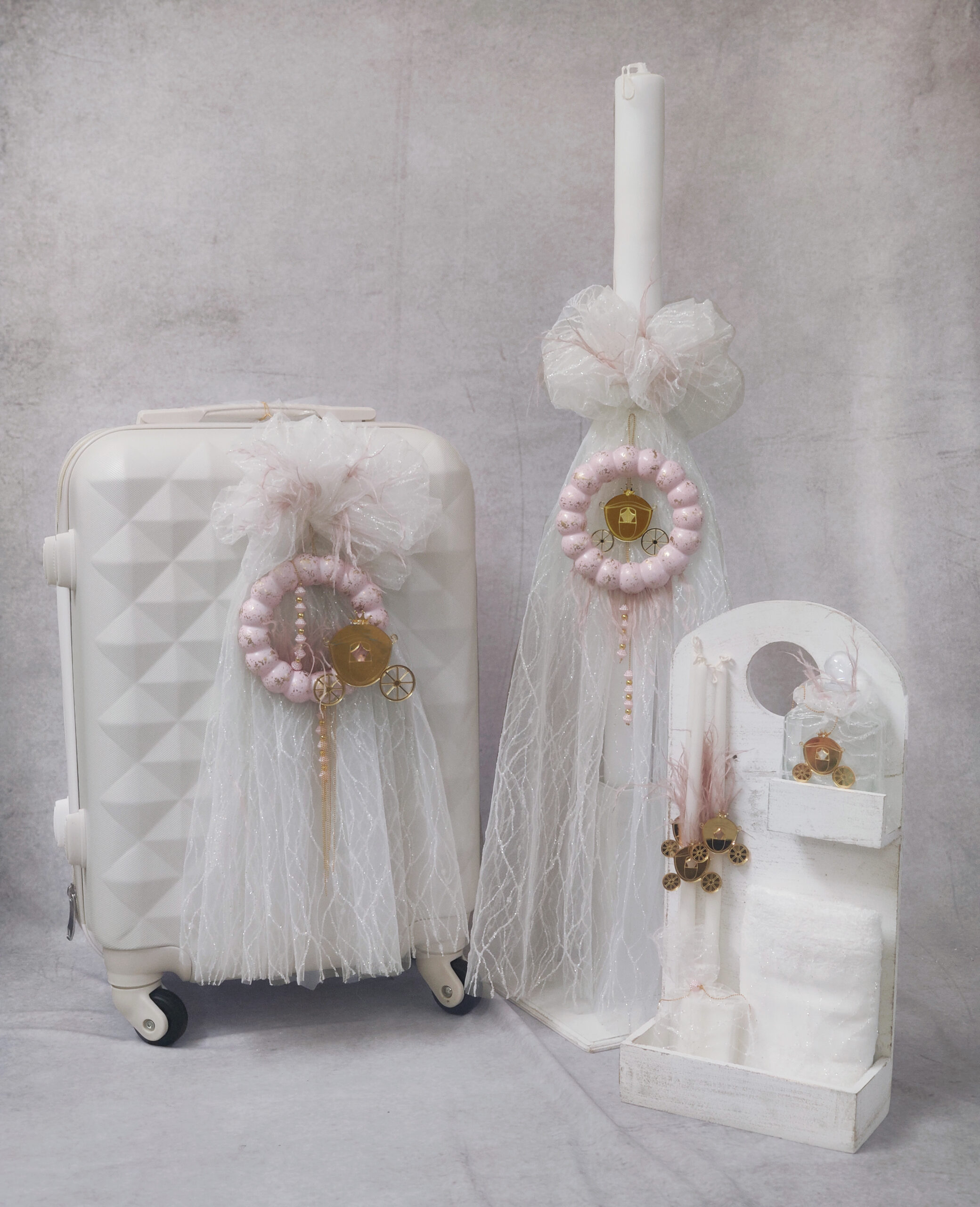 Πακέτο βάπτισης για κορίτσι με θέμα άμαξα σε λευκές και ροζ αποχρώσεις.