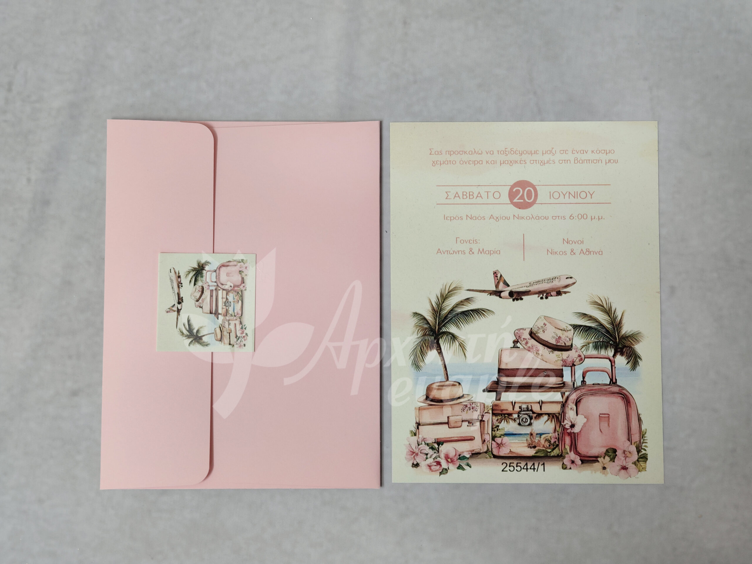 Προσκλητήριο βάπτισης με θέμα "Travel the world" και ροζ φάκελο.