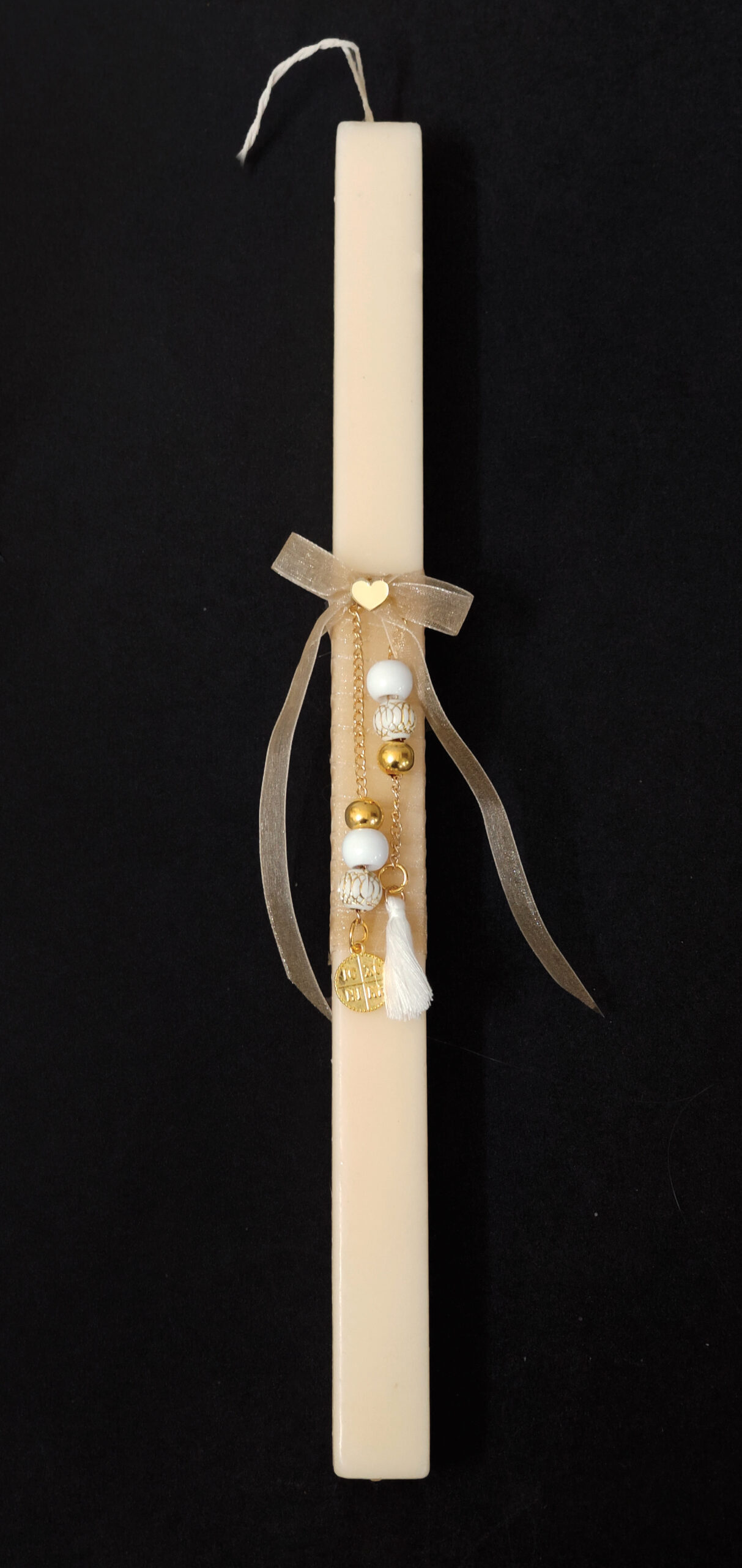 Χειροποίητη πασχαλινή λαμπάδα διακοσμημένη με φιόγκο με καρδια από χρυσό καθρέφτη πλέξι γκλας και κομπολόι από λευκές και χρυσές χάντρες με κωνσταντινάτο