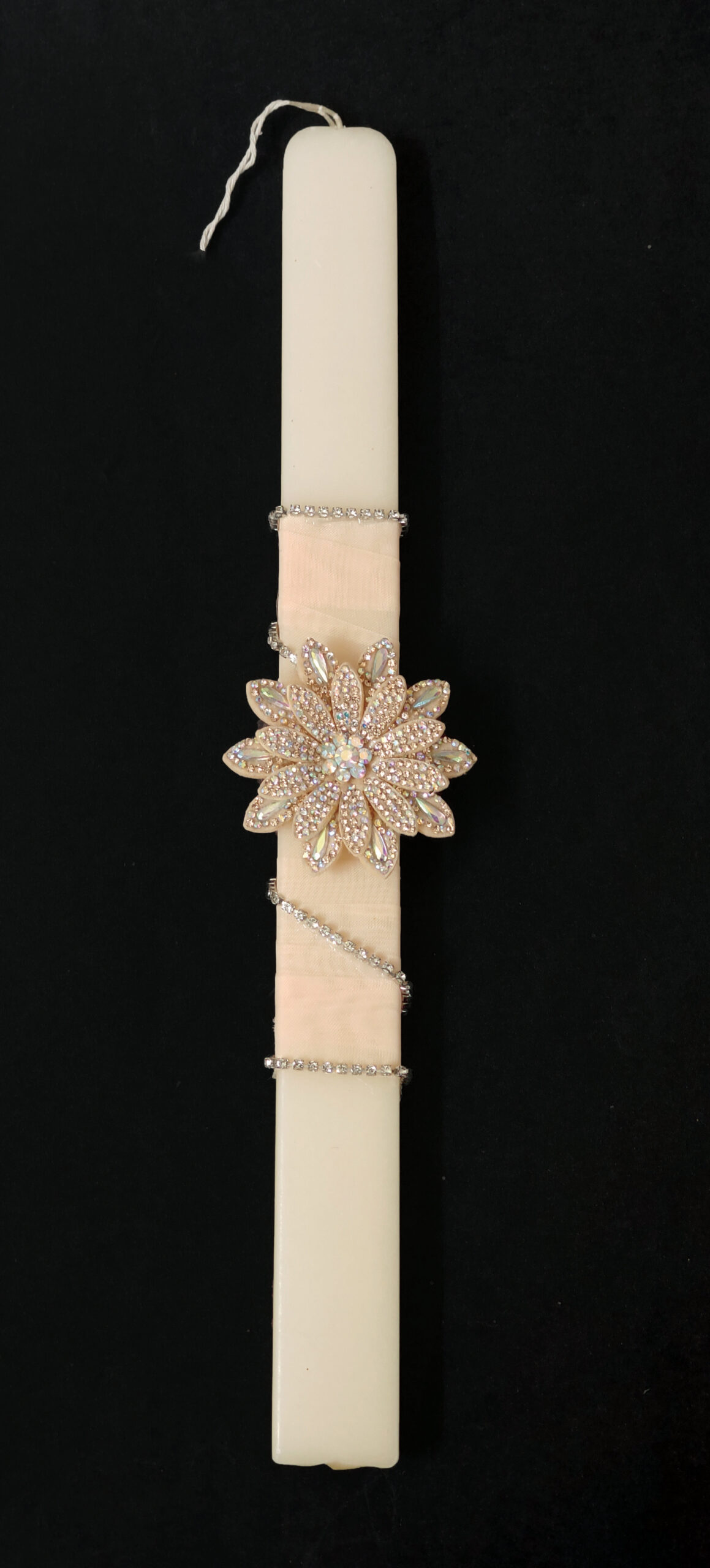 Χειροποίητη πασχαλινή λαμπάδα διακοσμημένη με δερμάτινο λουλούδι με στρας και αλυσίδα με στρας.