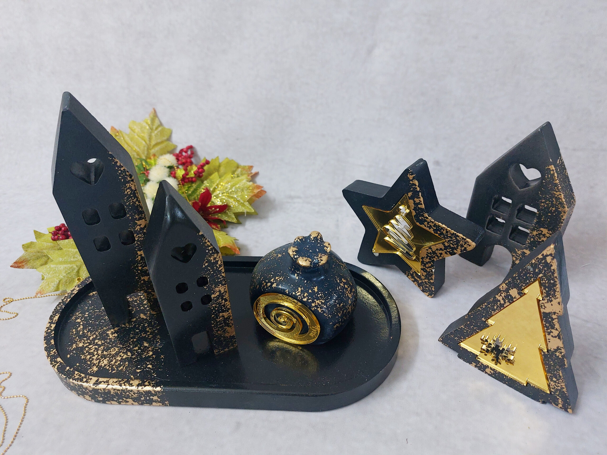 Χριστουγεννιάτικη σύνθεση με κεραμικά αστέρια με χρυσό plexiglass, σπιτάκια και δέντρο
