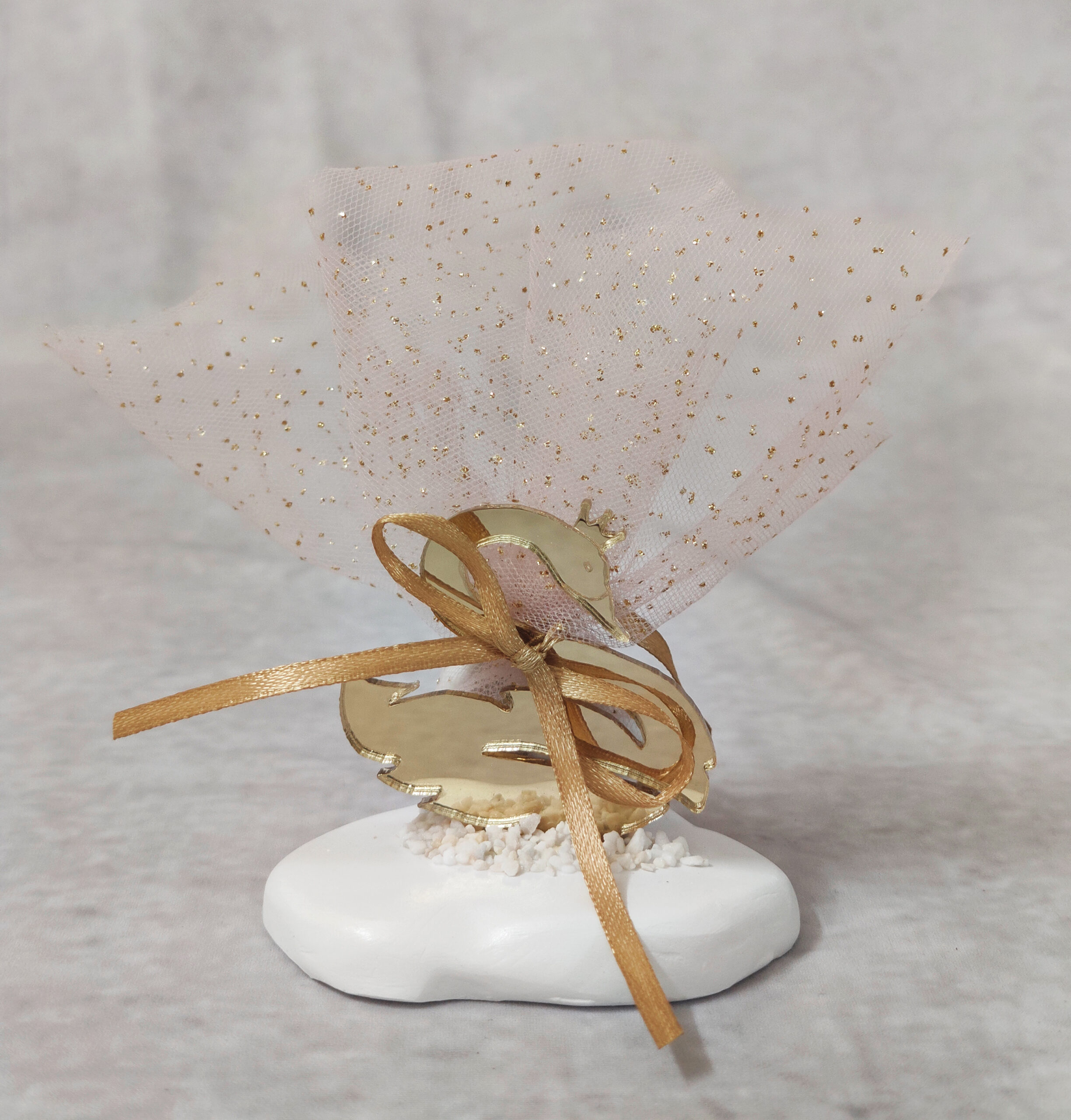 Μπομπονιέρα βάπτισης κύκνος από χρυσό καθρέφτη plexi-glass σε λευκή βάση με πετραδάκια, δεμένη σε ροζ τούλι με χρυσό glitter, με σατέν χρυσό κορδελάκι και 7 κουφέτα smarties.