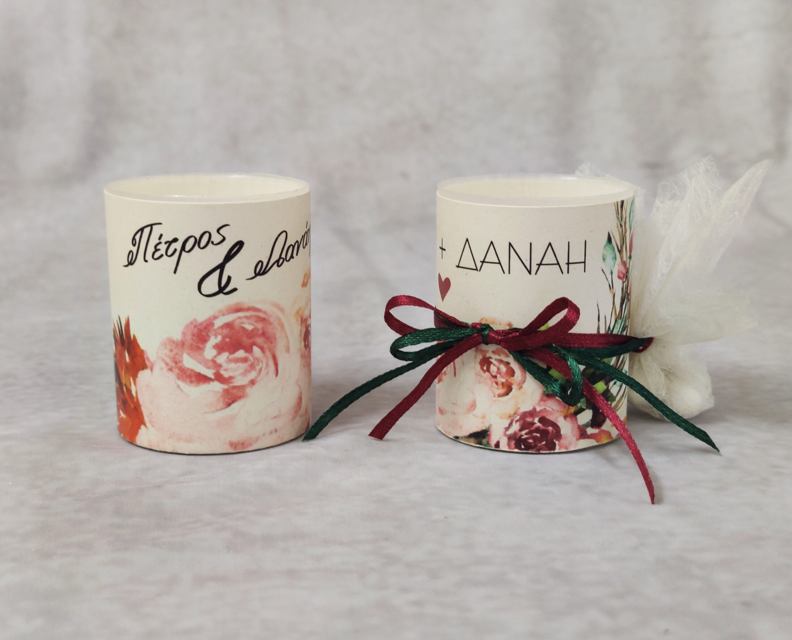 Μπομπονιέρα γάμου κερί σε θήκη με θέμα floral boho και τα ονόματα του ζευγαριού σε γραμματοσειρά της επιλογής σας, εκτυπωμένο περιμετρικά. Η μπομπονιέρα περιλαμβάνει 5 κουφέτα αμυγδάλου ή 3 κουφέτα αμυγδάλου και 2 σοκολατένιες καρδιές σε εκρού τούλι, δεμένα με μπορντό και κυπαρισσί σατέν κορδέλα.