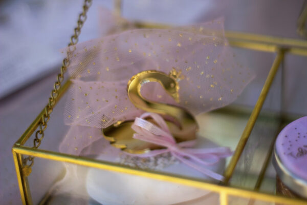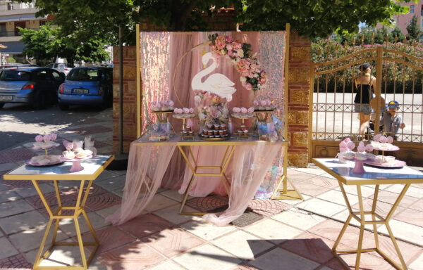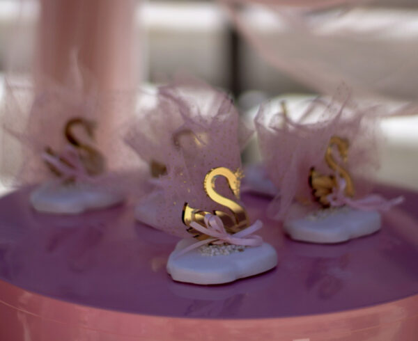 Στολισμός βάπτισης για κορίτσι με θέμα ρομαντικός κύκνος και λουλούδια σε ροζ παλ αποχρώσεις, με χρυσά στοιχεία.