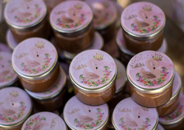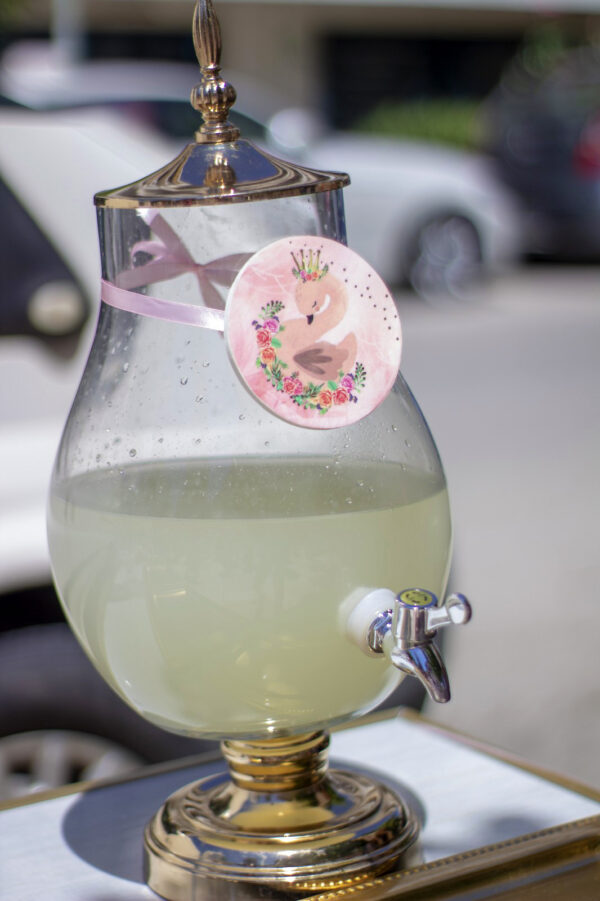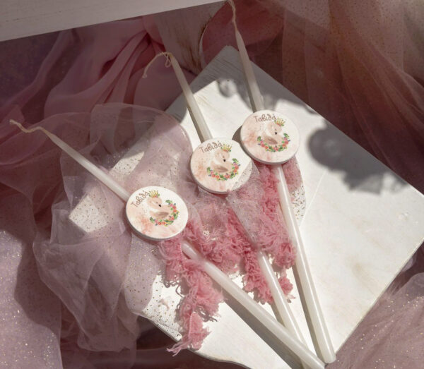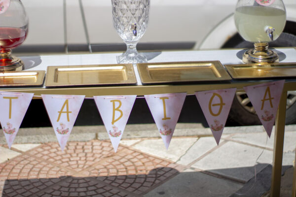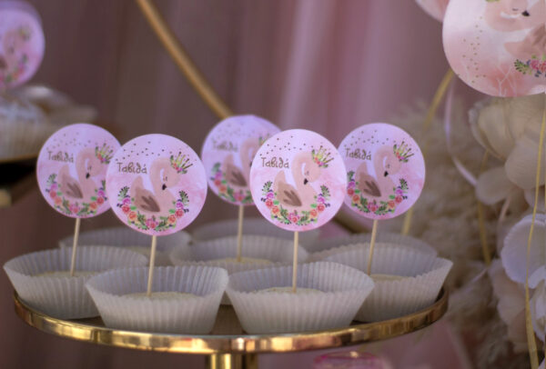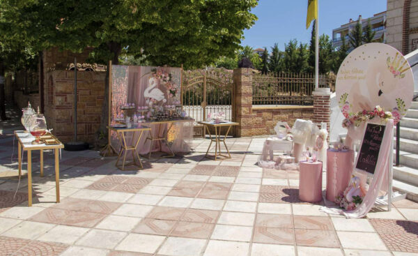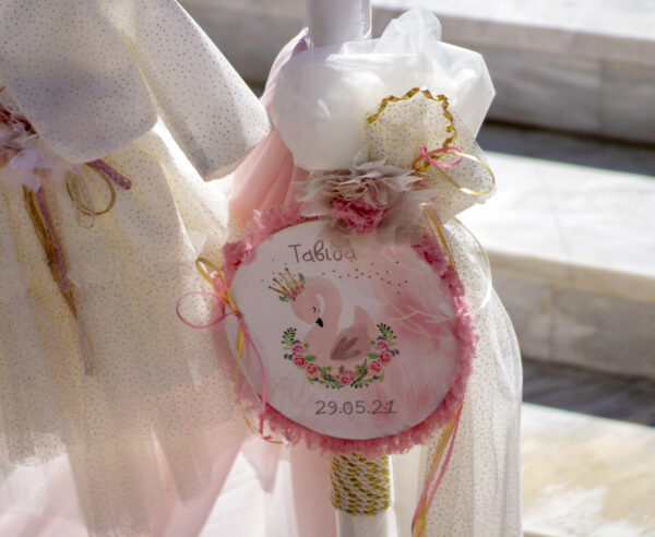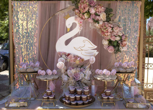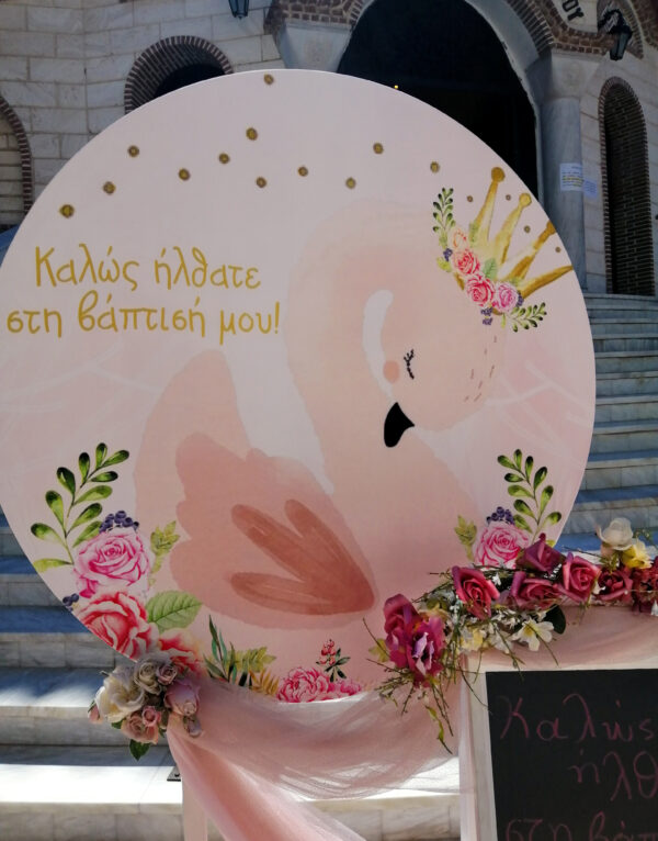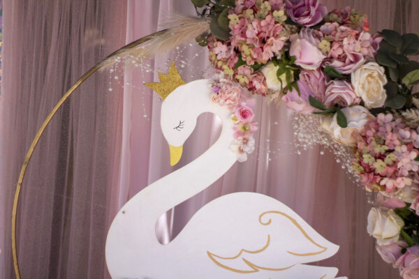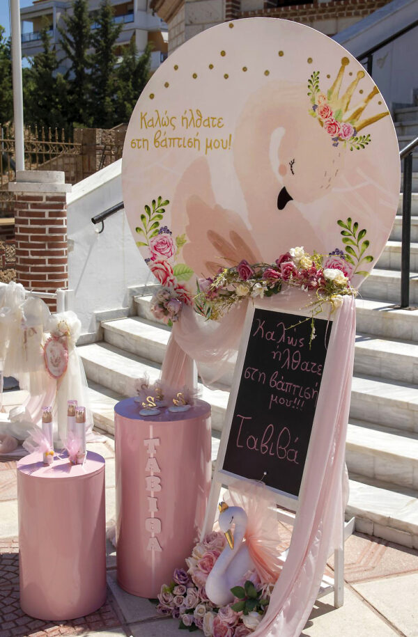 Στολισμός βάπτισης για κορίτσι με θέμα ρομαντικός κύκνος και λουλούδια.