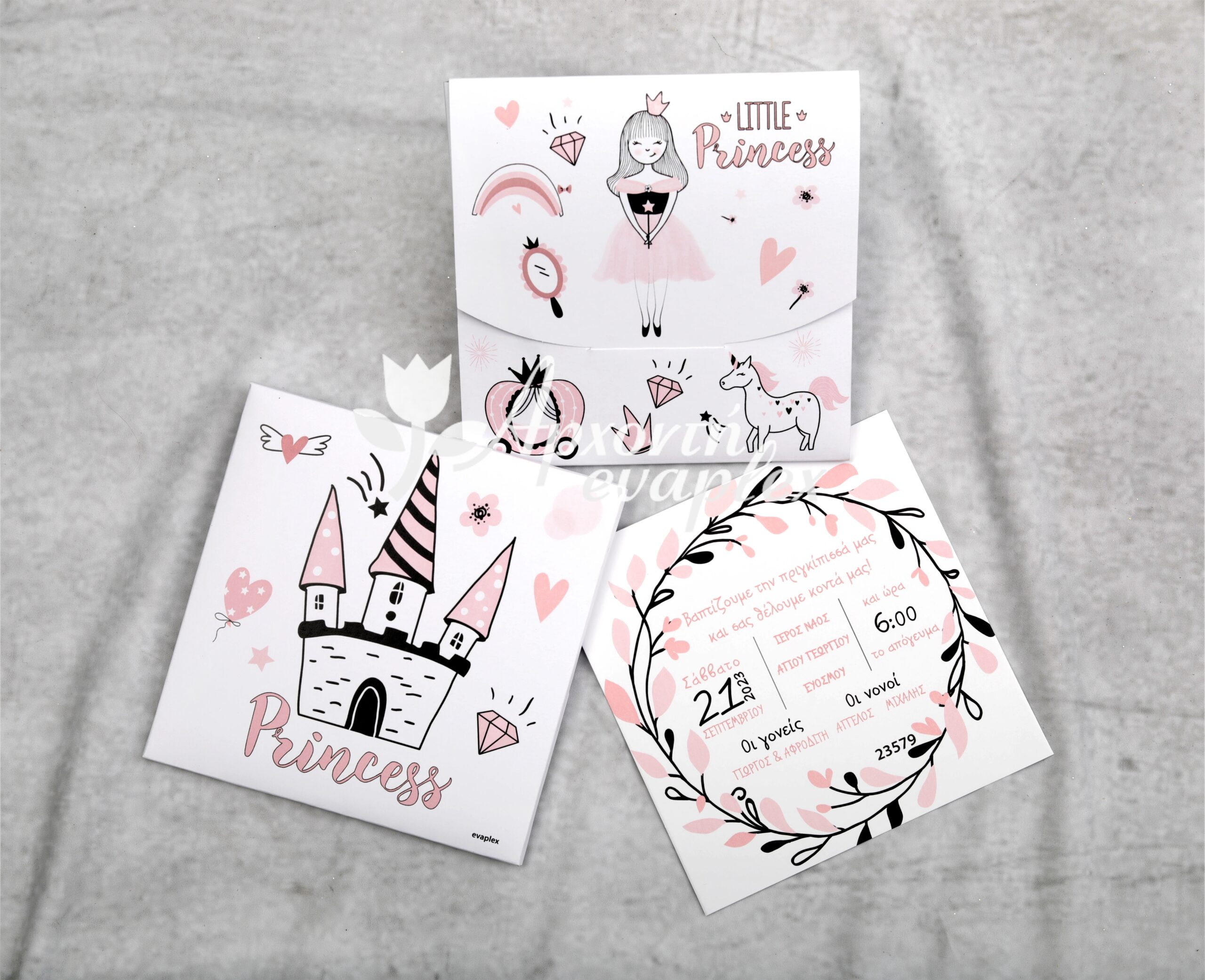Προσκλητήριο βάπτισης με θέμα Little Princess σε λευκό χαρτί με εκτυπωμένο φάκελο – κουτί και στις δύο όψεις.