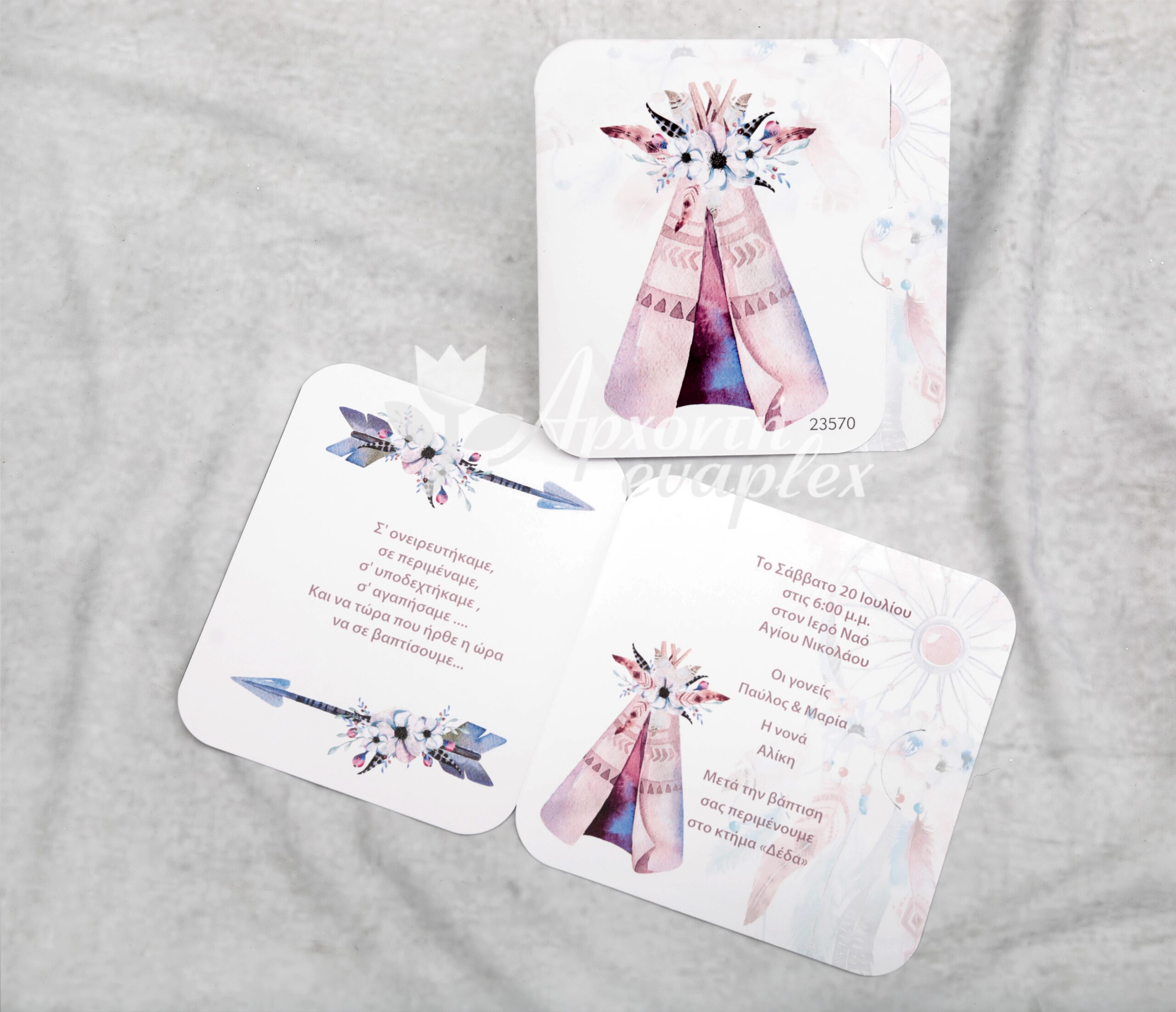 Δίπτυχο προσκλητήριο βάπτισης με ιδιαίτερο κοπτικό, με θέμα Boho σκηνή για κορίτσι και εκτύπωση εσωτερικά και εξωτερικά.