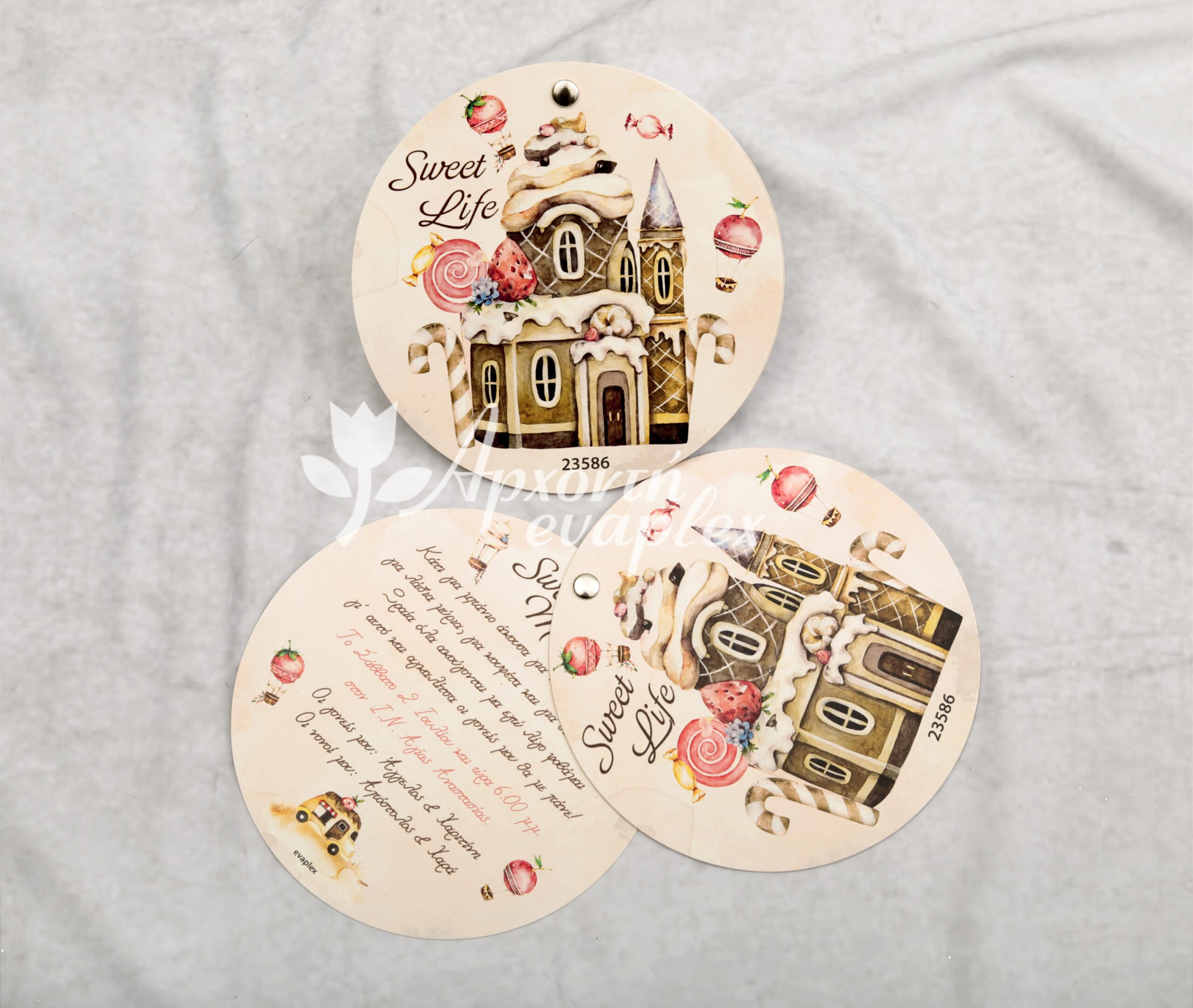Προσκλητήριο βάπτισης με θέμα ζαχαρούπολη, με διπλή στρόγγυλη κάρτα, σε εκρού οικολογικό χαρτί ενωμένο με τρουξ.
