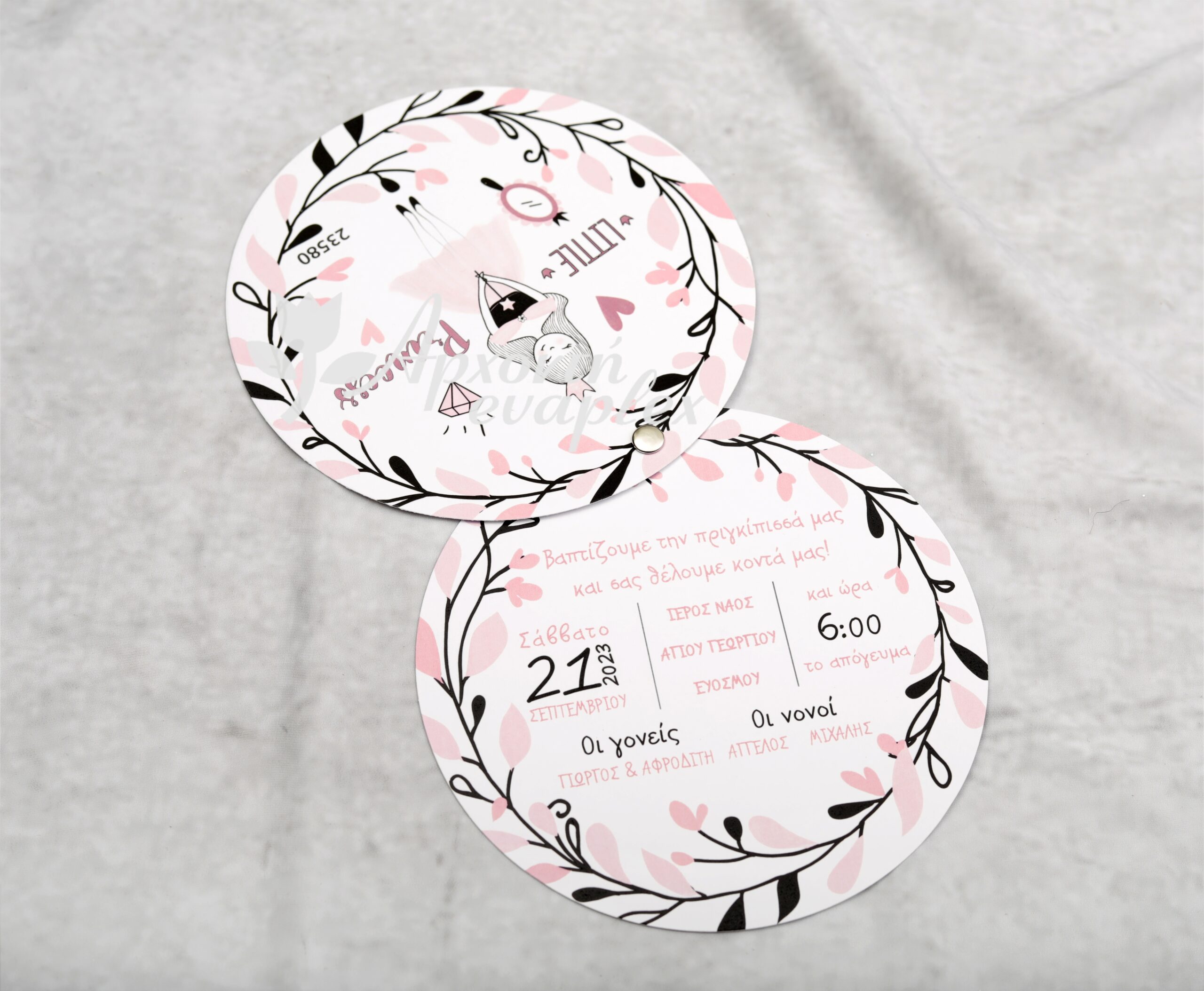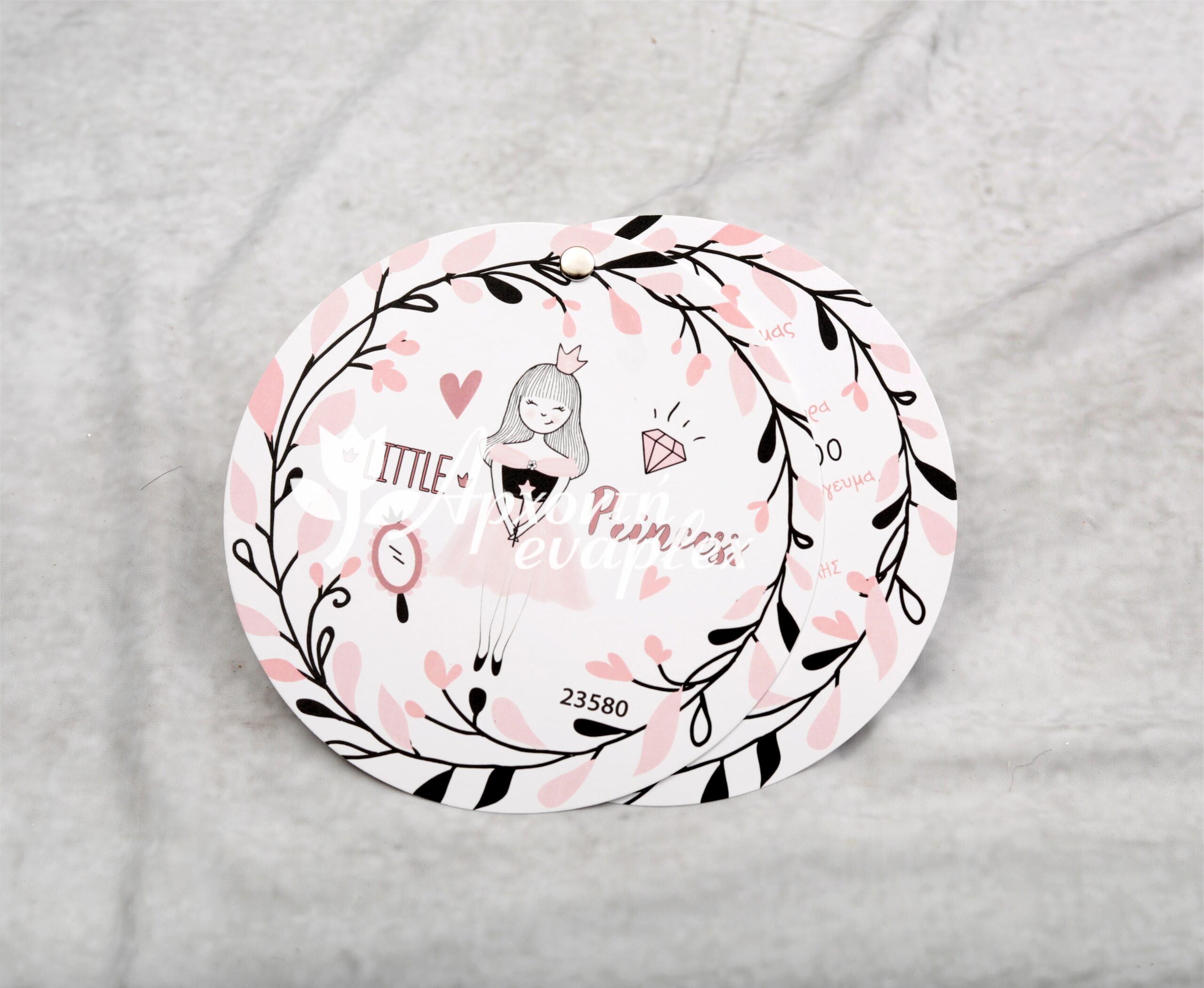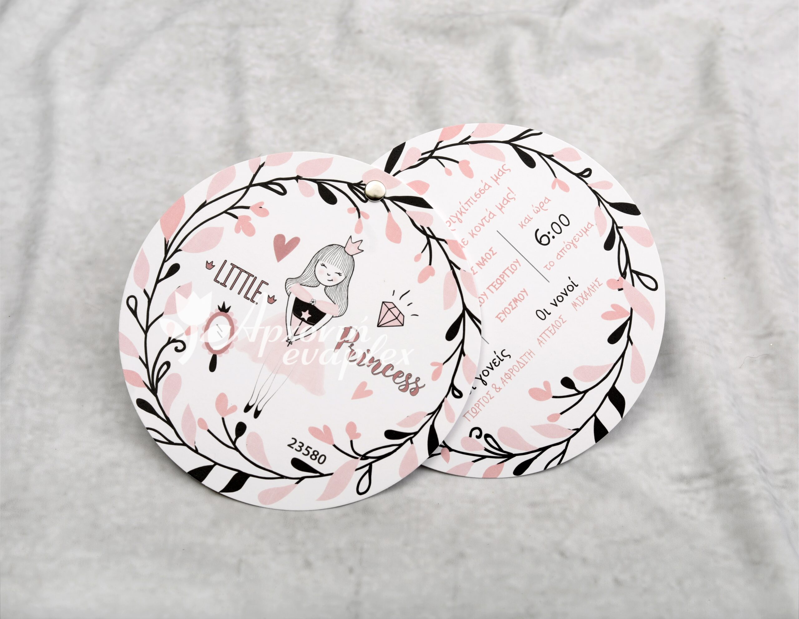 Προσκλητήριο βάπτισης με θέμα πριγκίπισσα, με διπλή στρόγγυλη κάρτα, ενωμένο με τρουξ.