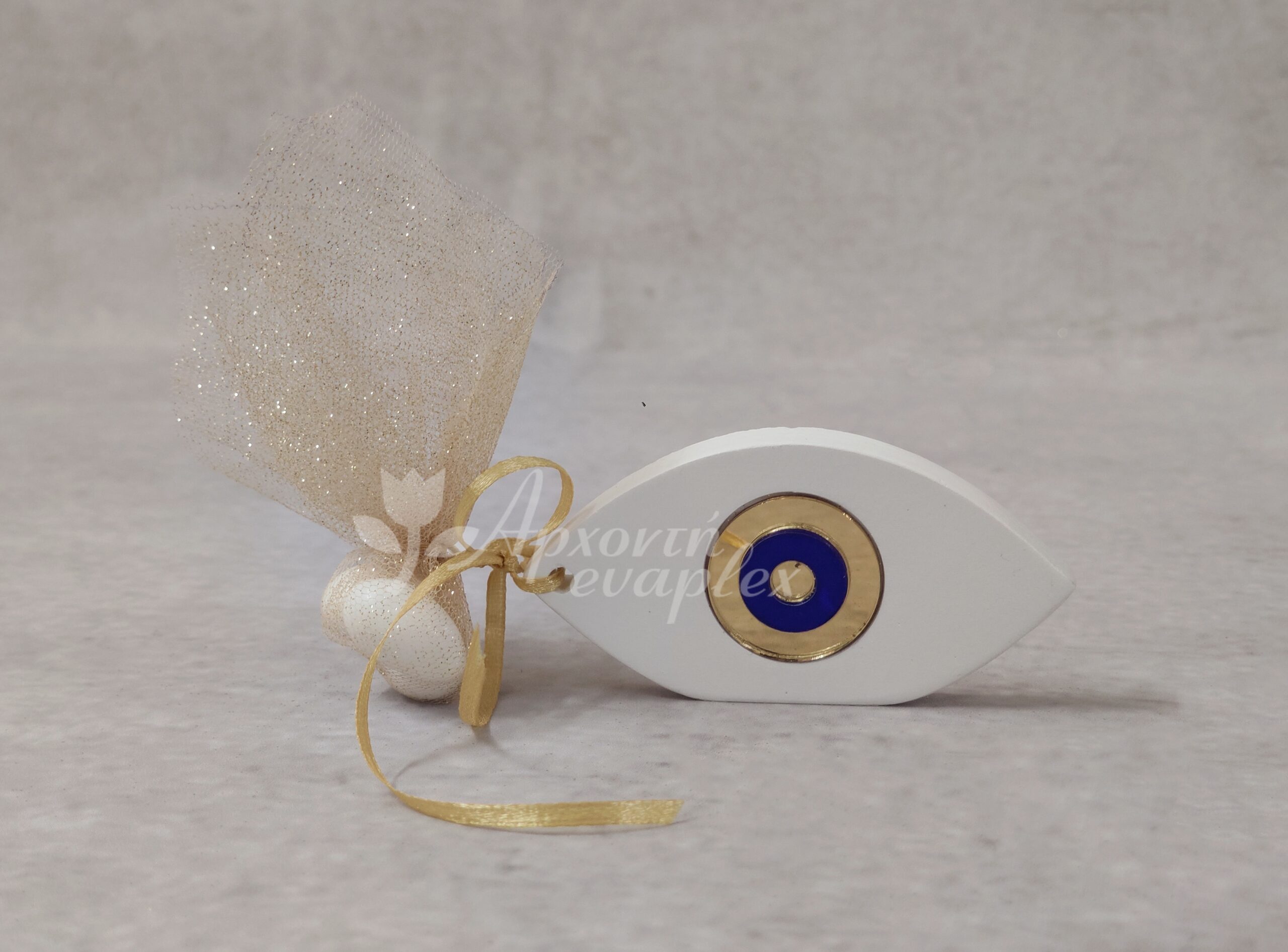 Μπομπονιέρα γάμου - βάπτισης Κωνσταντινάτο από χρυσό καθρέφτη plexi-glass και εκρού τούλι με χρυσό glitter.
