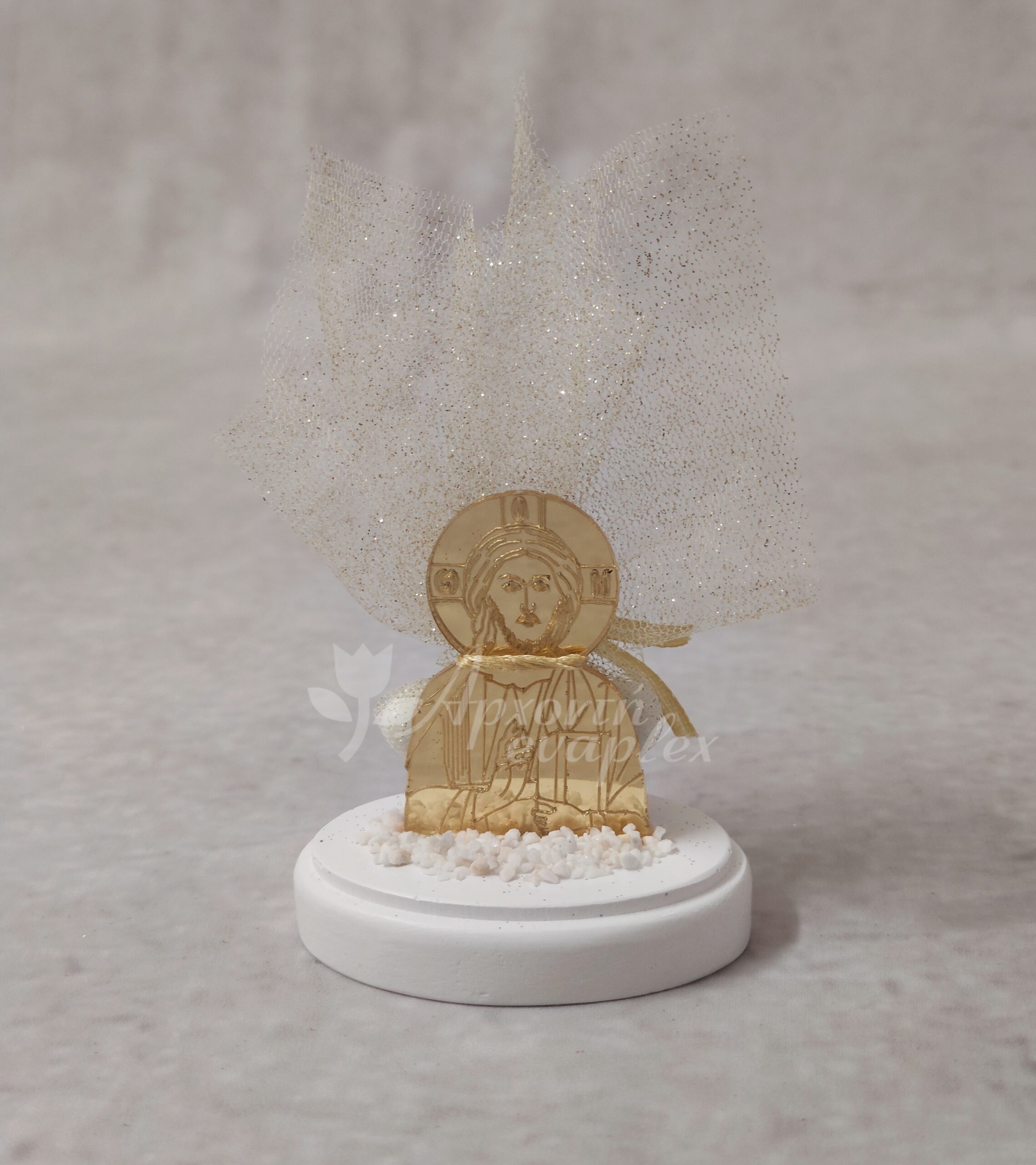 Μπομπονιέρα γάμου – βάπτισης Χριστός από χρυσό καθρέφτη plexi-glass και εκρού τούλι με χρυσό glitter.