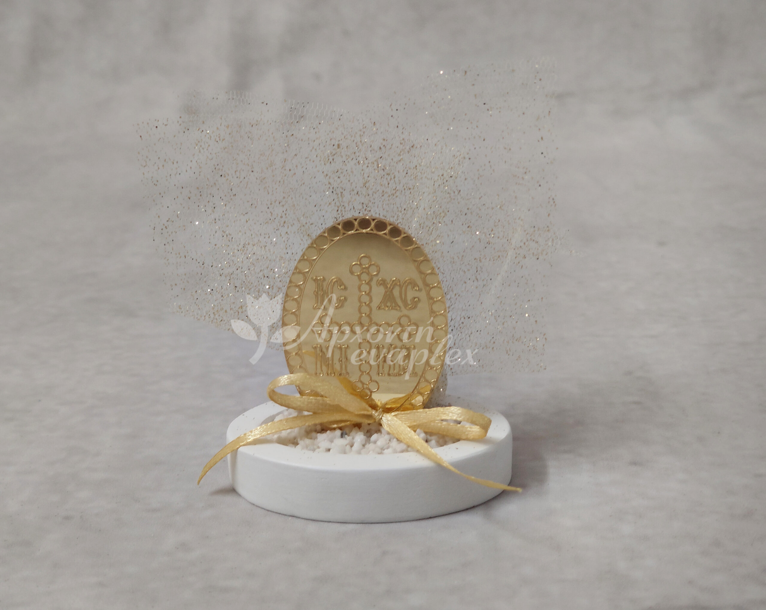 Μπομπονιέρα γάμου – βάπτισης Κωνσταντινάτο από χρυσό καθρέφτη plexi-glass και εκρού τούλι με χρυσό glitter.