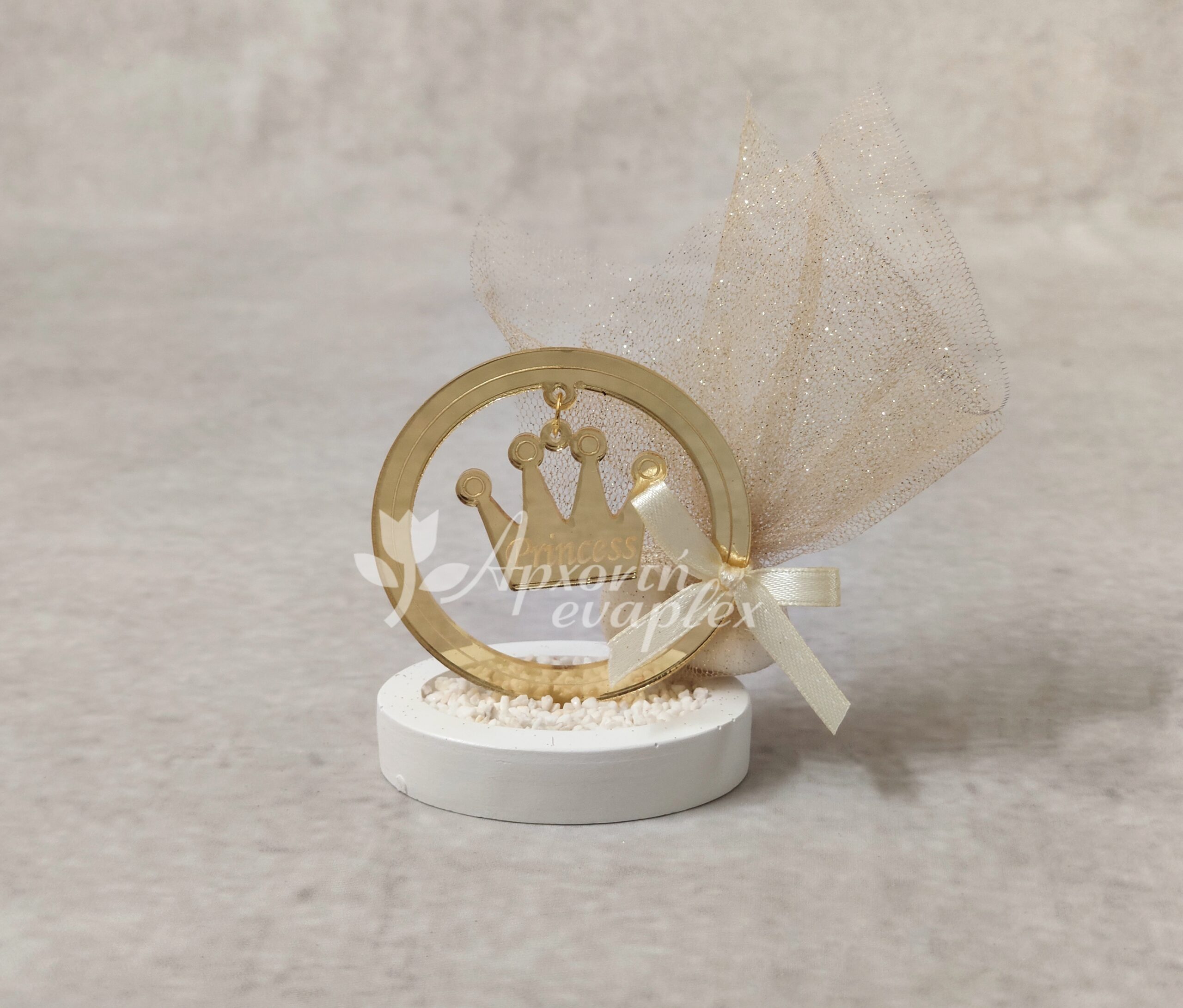 Μπομπονιέρα γάμου - βάπτισης Κωνσταντινάτο από χρυσό καθρέφτη plexi-glass και εκρού τούλι με χρυσό glitter.