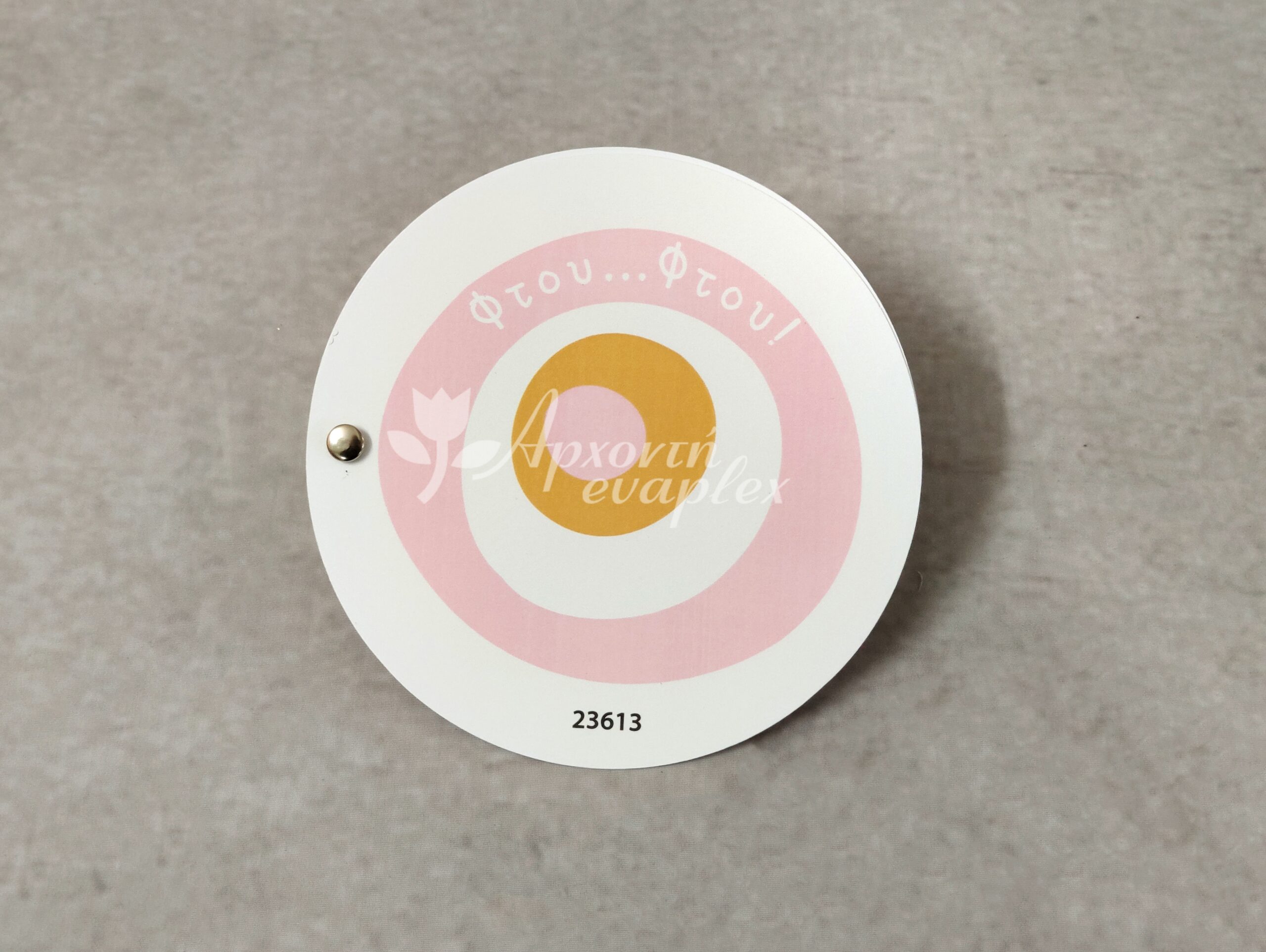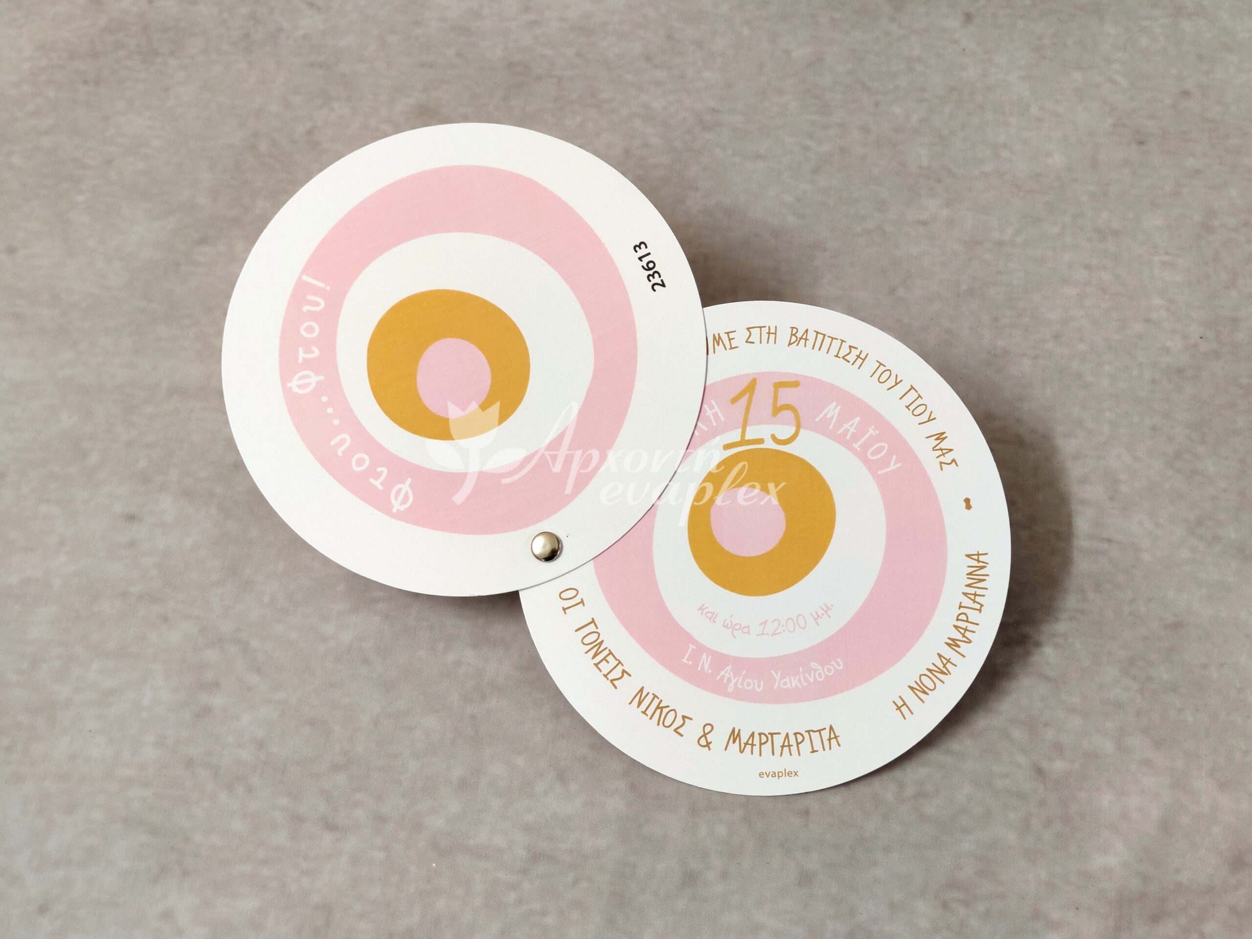 Προσκλητήριο βάπτισης με θέμα το μάτι για κορίτσι, με διπλή στρόγγυλη κάρτα, ενωμένο με τρουξ.