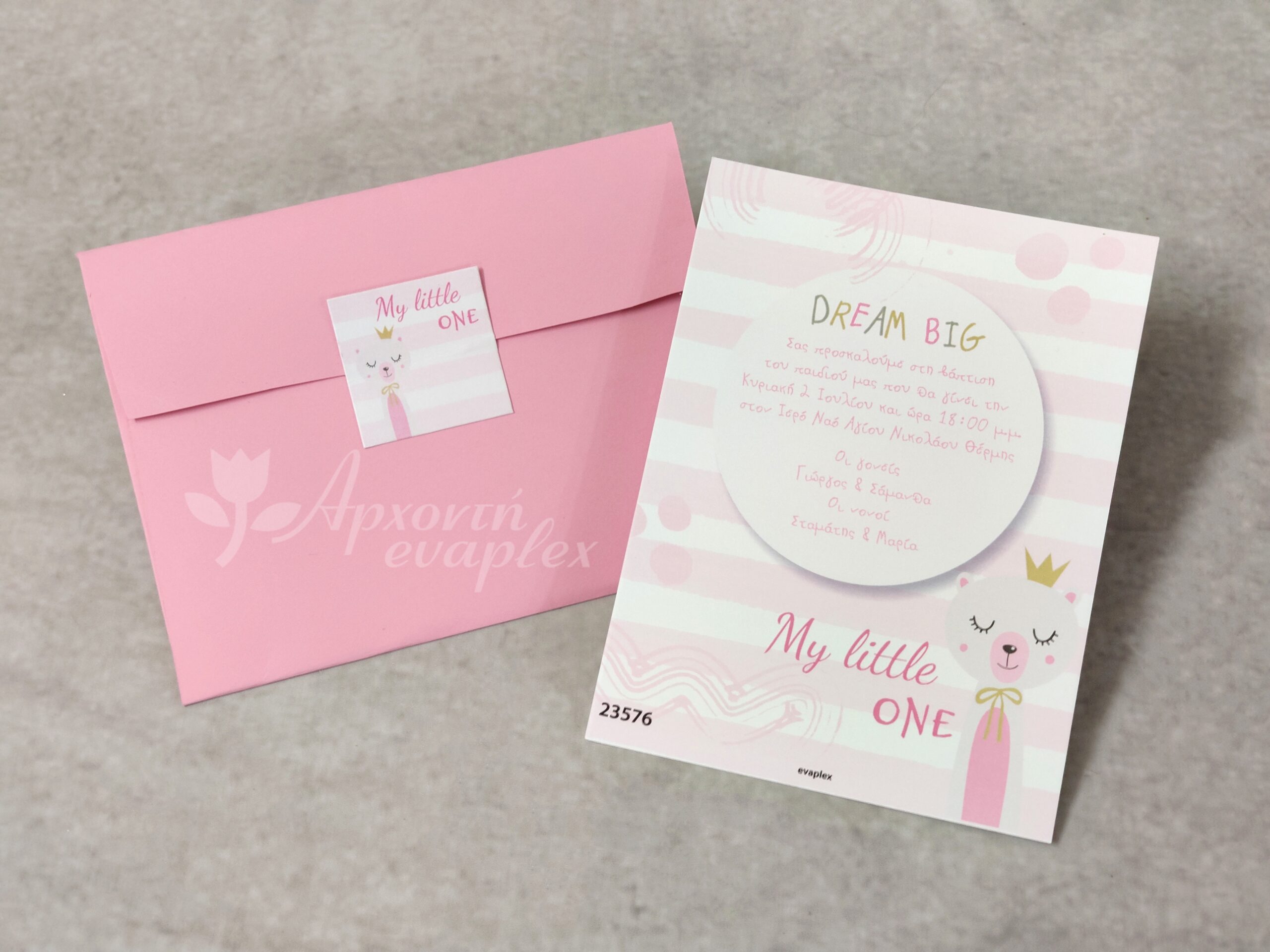 Προσκλητήριο βάπτισης με θέμα Dream Big αρκουδάκι για κορίτσι  και ροζ φάκελο με εκτυπωμένο καρτελάκι στο κλείσιμο.