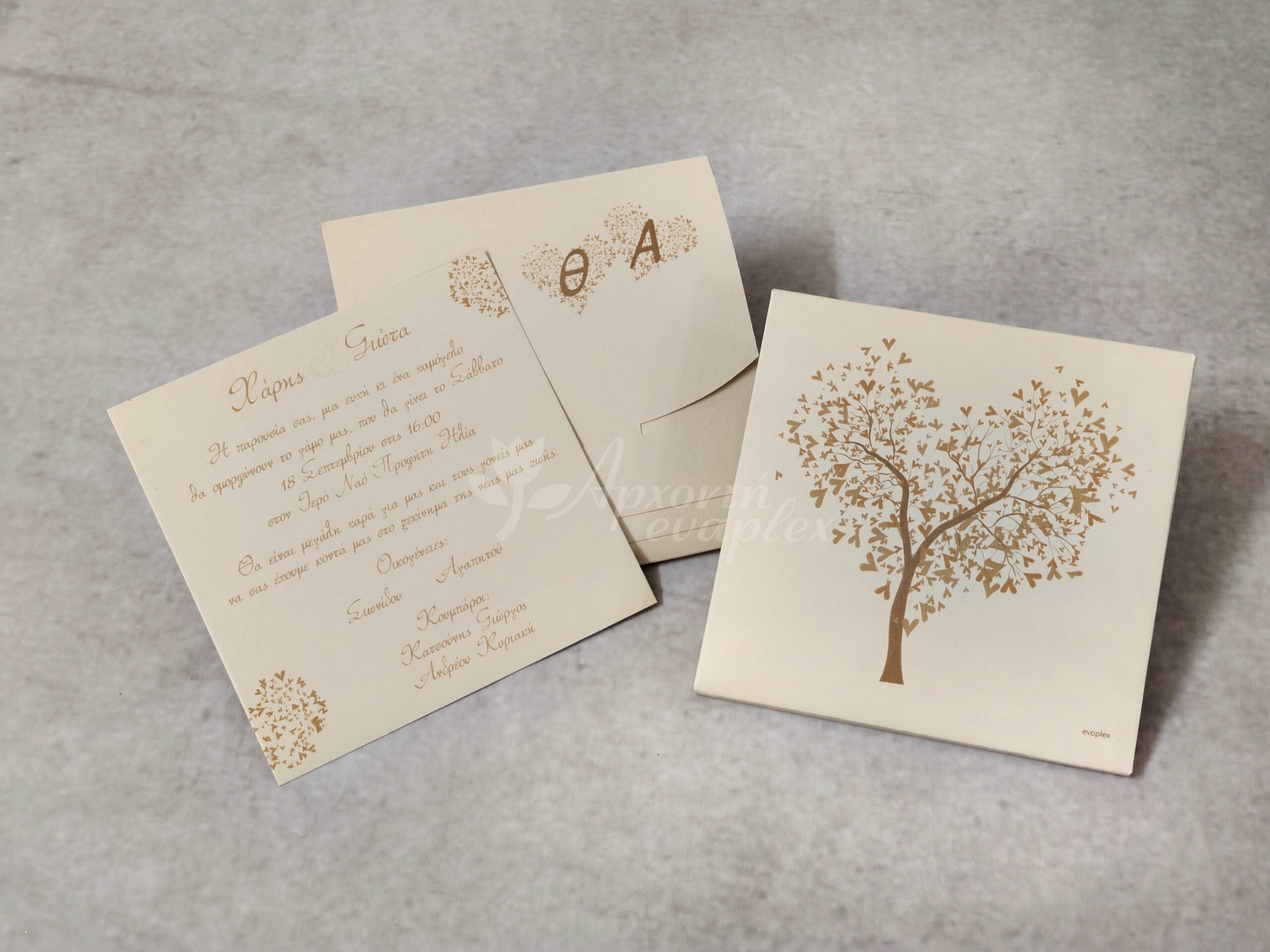 Προσκλητήριο γάμου σε σοκολά χαρτί με θέμα δέντρο ζωής με καρδιές και εκτυπωμένος φάκελος – κουτί με το ίδιο θέμα και τα μονογράμματα του ζευγαριού.