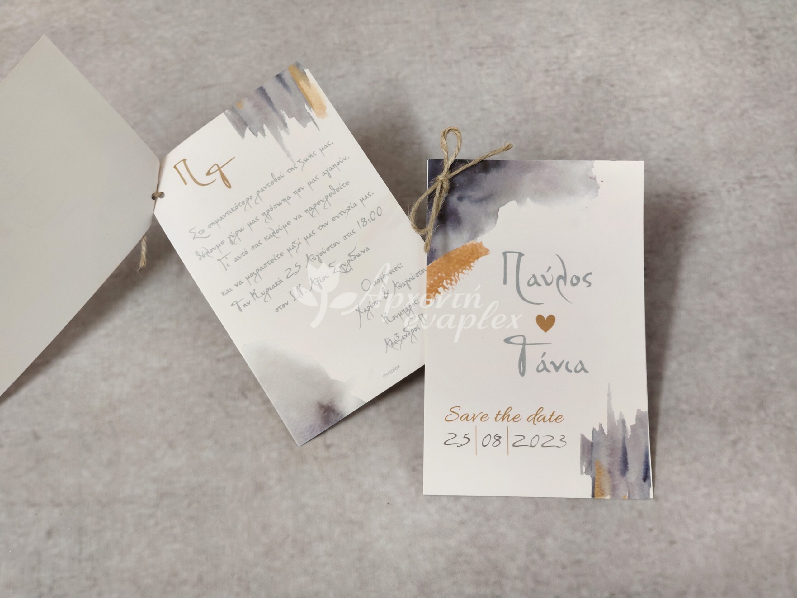Προσκλητήριο γάμου με διπλή κάρτα, δεμένη με φιογκάκι λινάτσας.