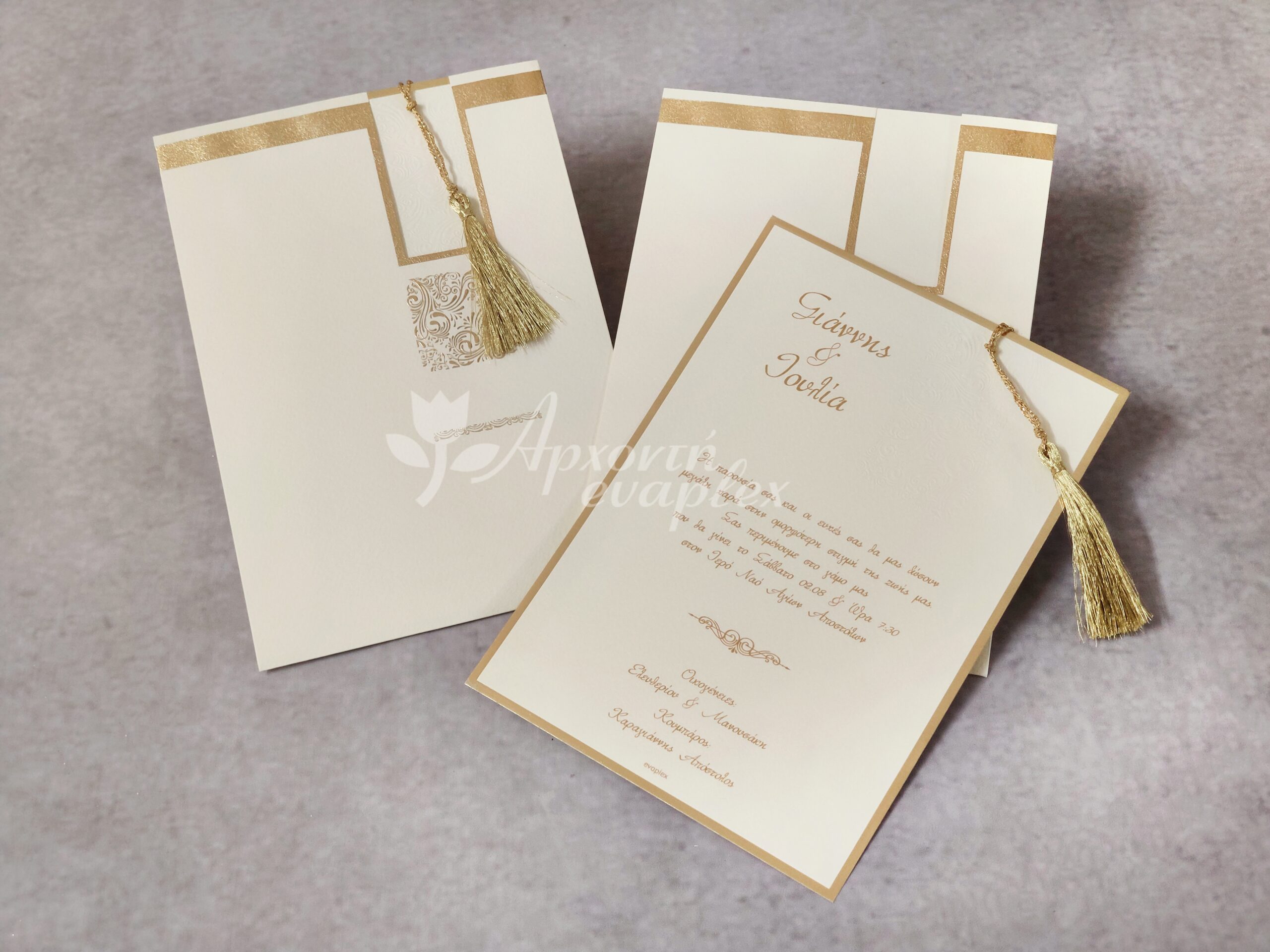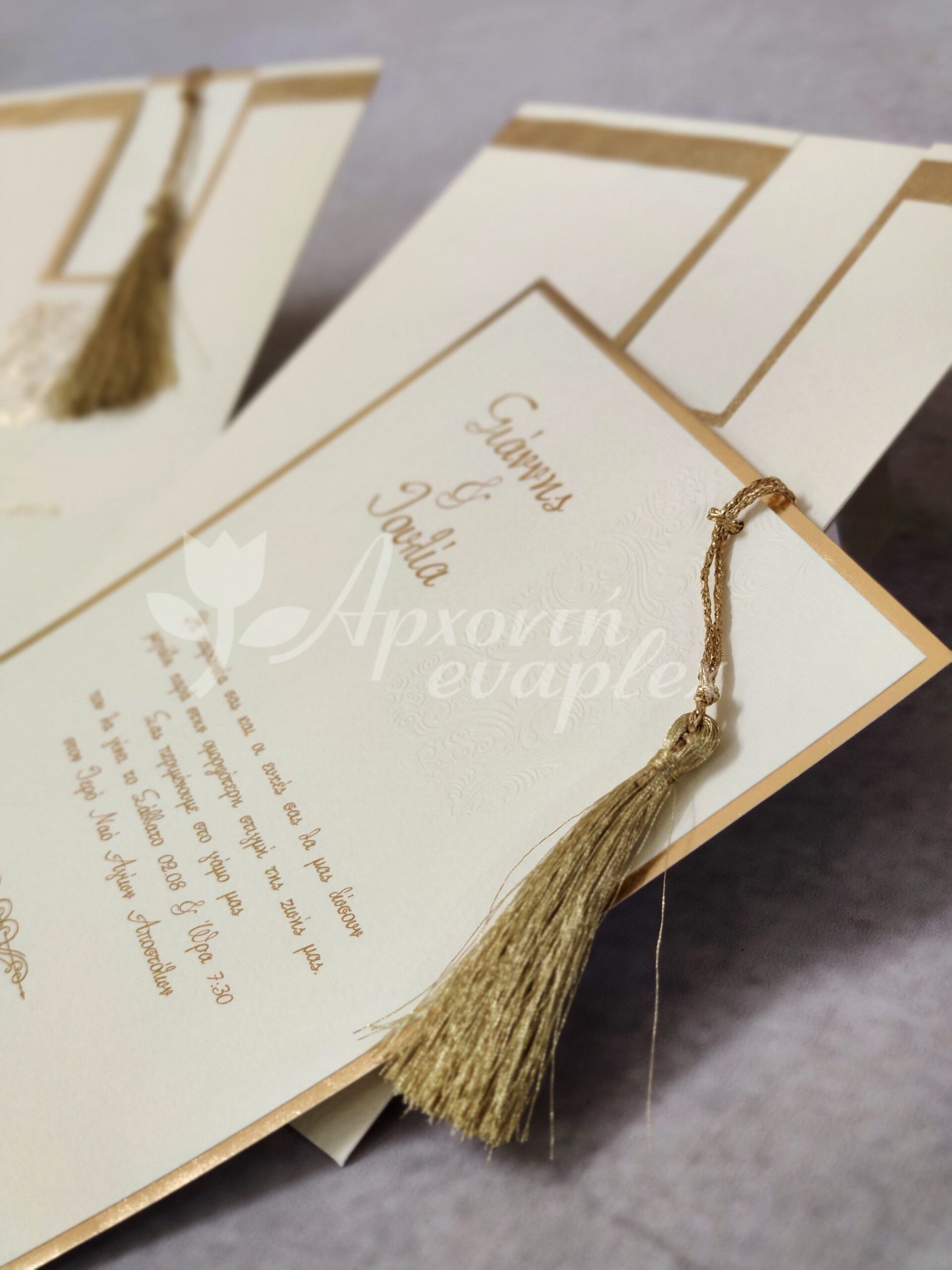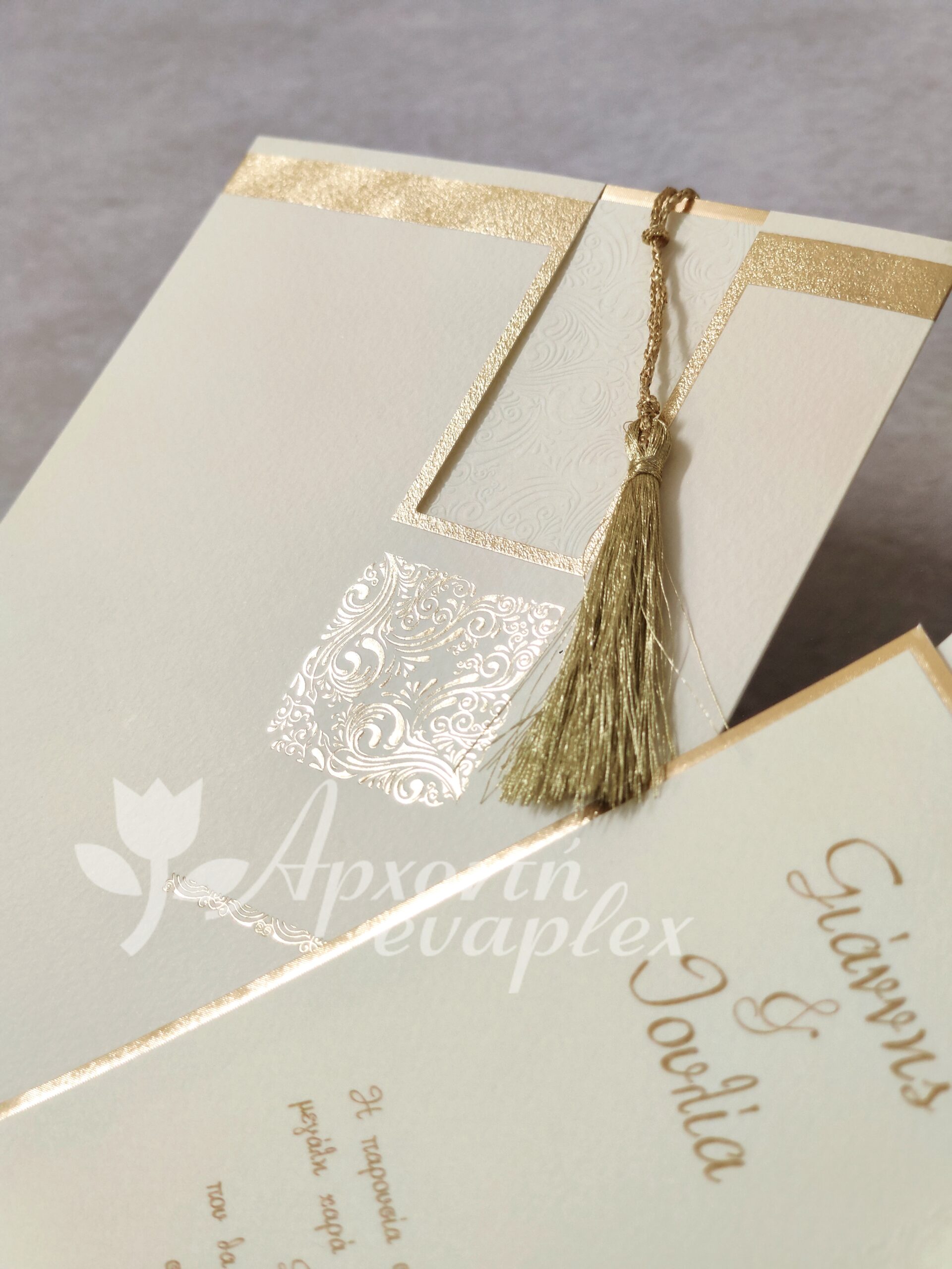 Προσκλητήριο γάμου με χρυσοτυπία, αναγλυφότητες και χρυσή φουντίτσα.
