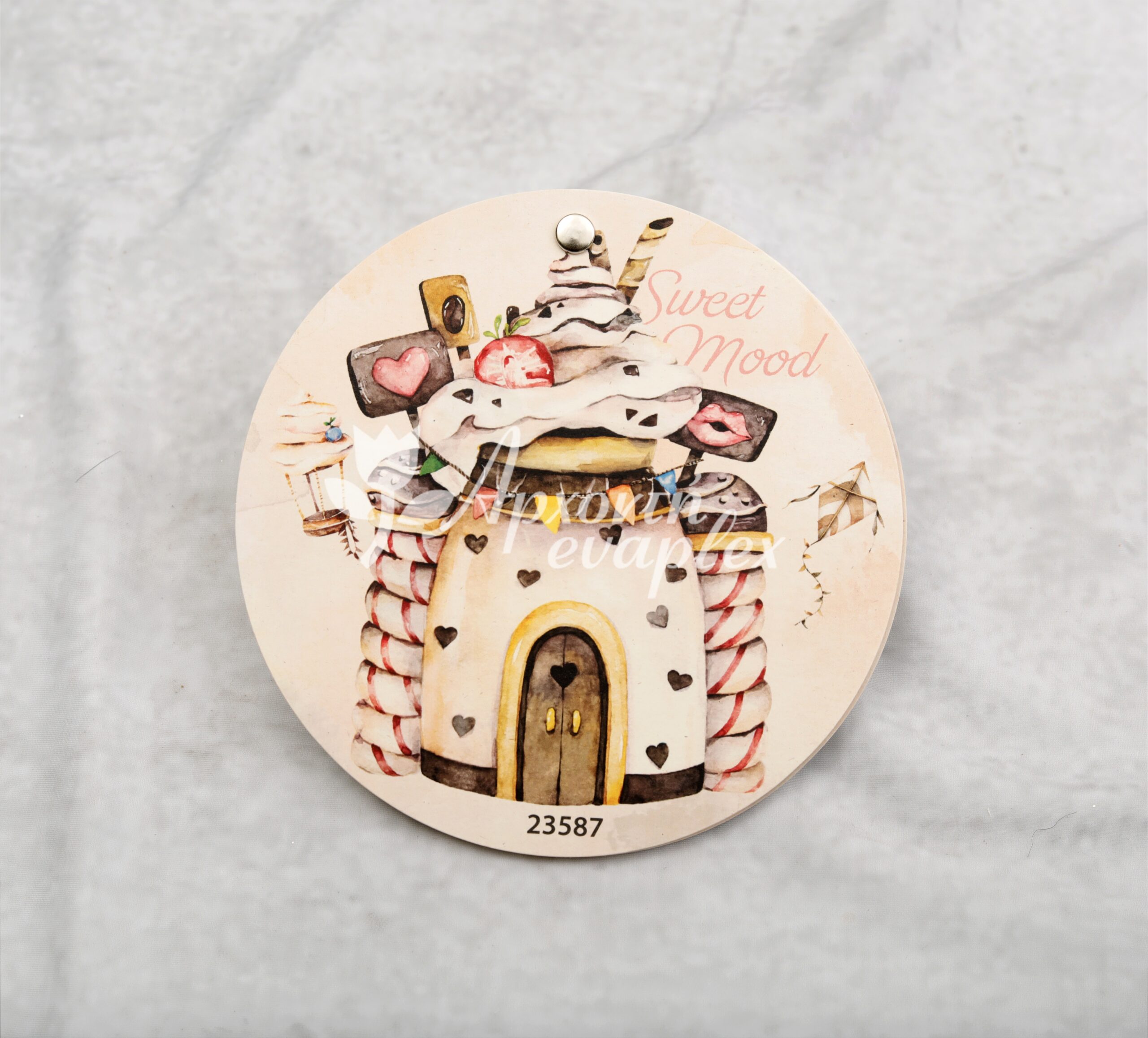 Προσκλητήριο βάπτισης με θέμα ζαχαρούπολη, με διπλή στρόγγυλη κάρτα σε εκρού οικολογικό χαρτί, ενωμένο με τρουξ.