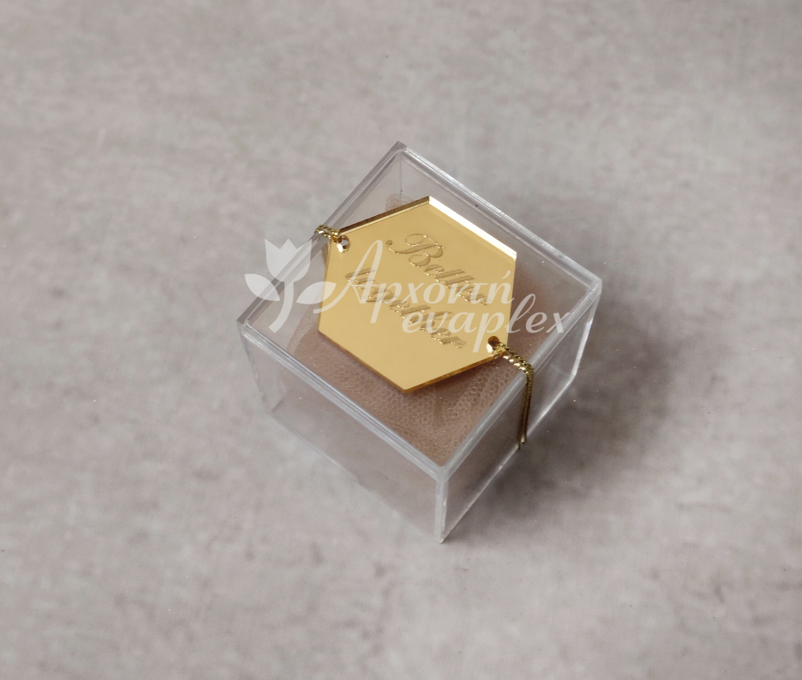 Μπομπονιέρα γάμου διάφανο κουτί με γεωμετρικό από χρυσό καθρέφτη plexi-glass.