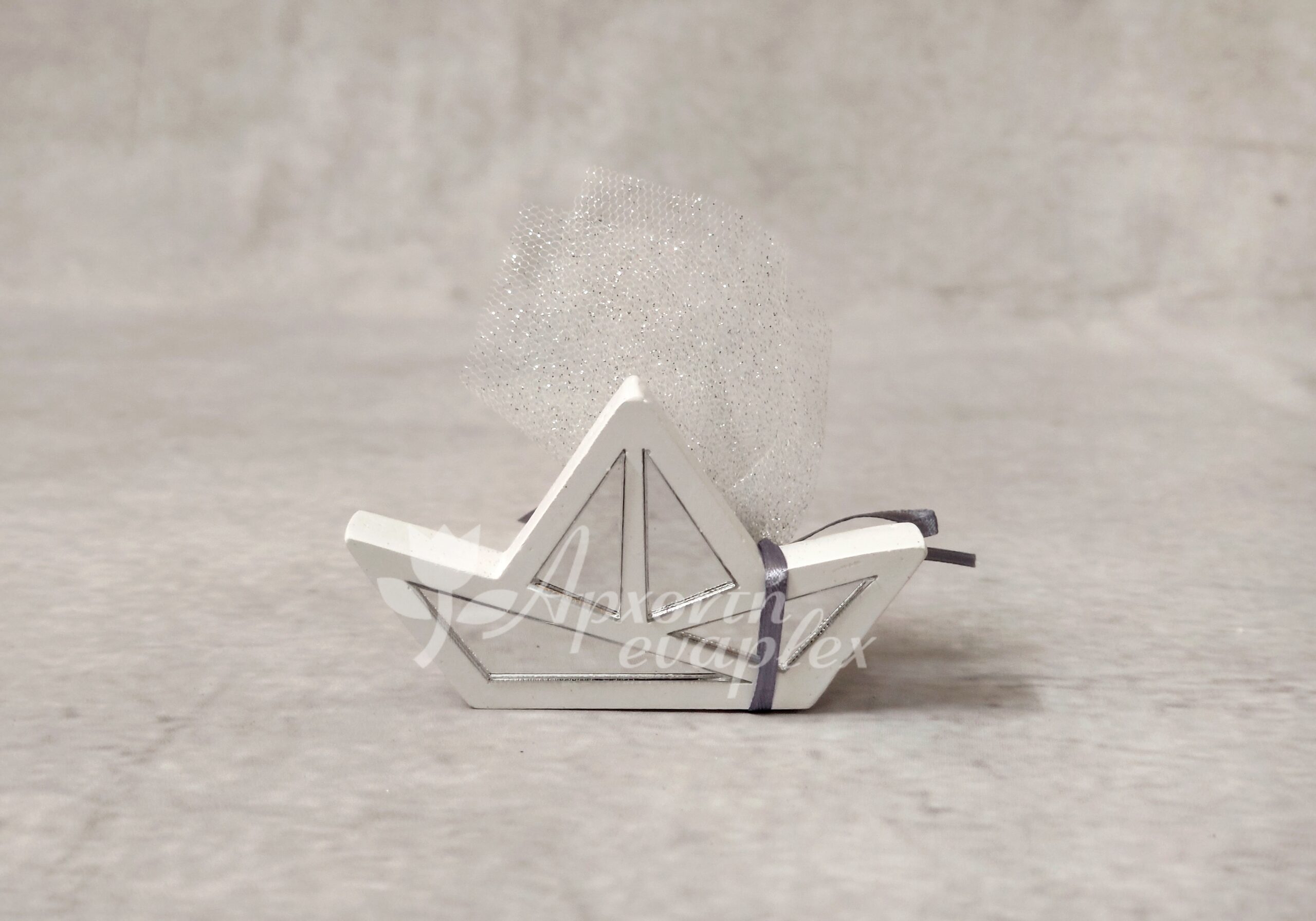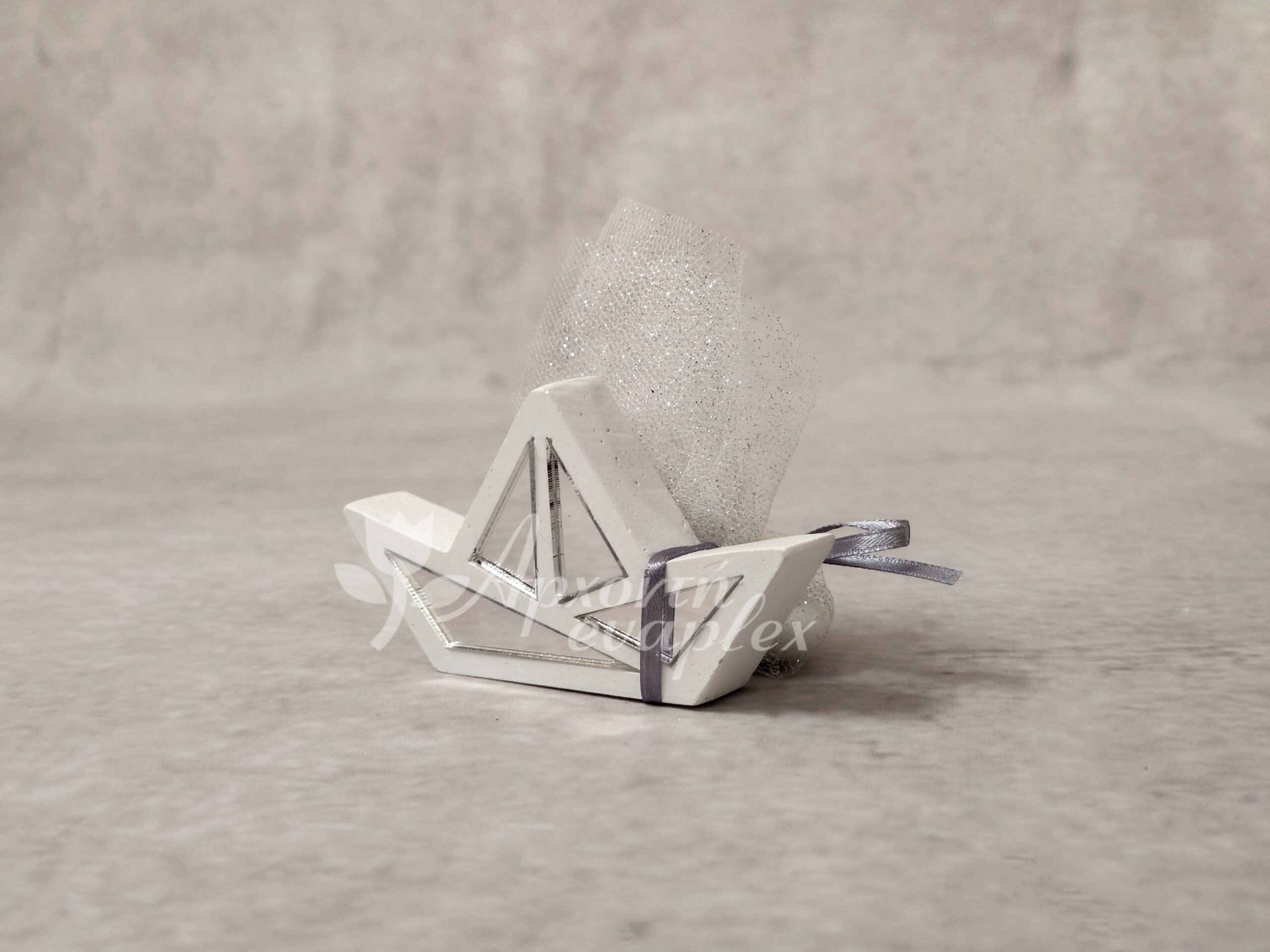 Μπομπονιέρα γάμου – βάπτισης κεραμικό καράβι με ασημί plexi glass καθρέφτη