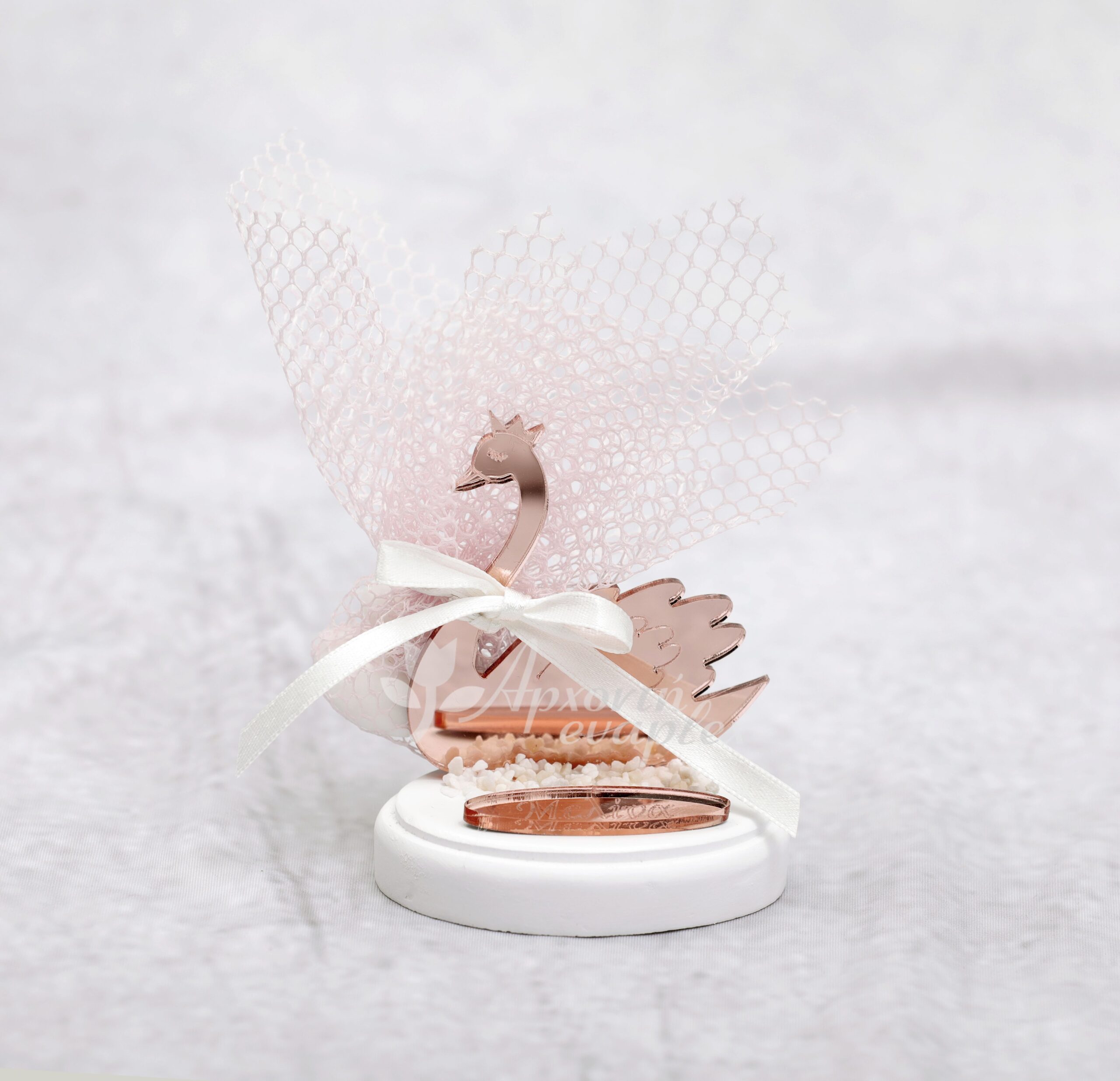 Μπομπονιέρα βάπτισης κύκνος από ροζ χρυσό καθρέφτη plexi-glass και ροζ δίχτυ.