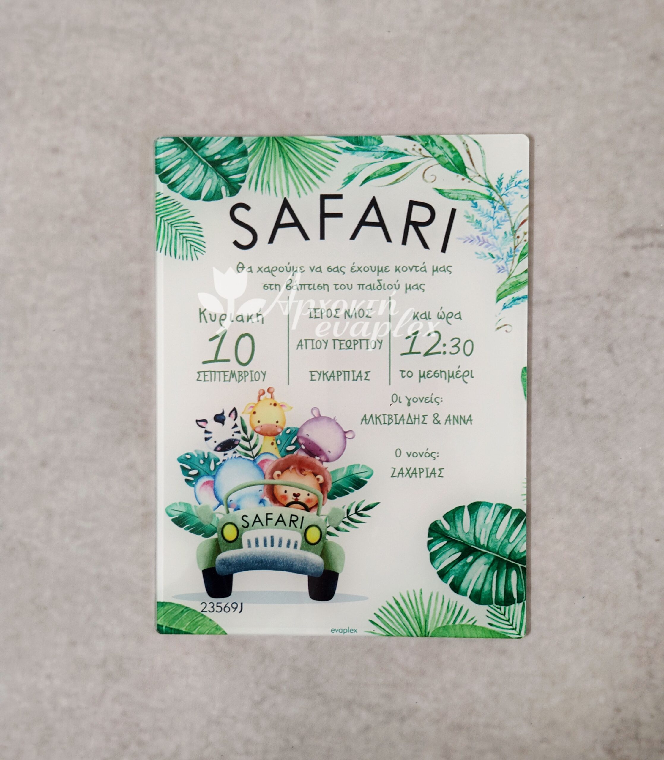 Plexi glass προσκλητήριο βάπτισης με θέμα Safari.