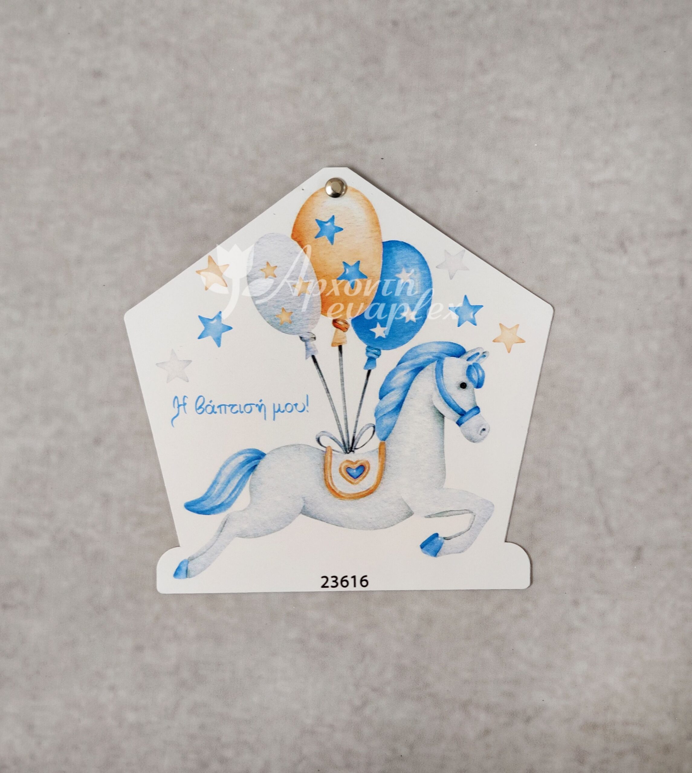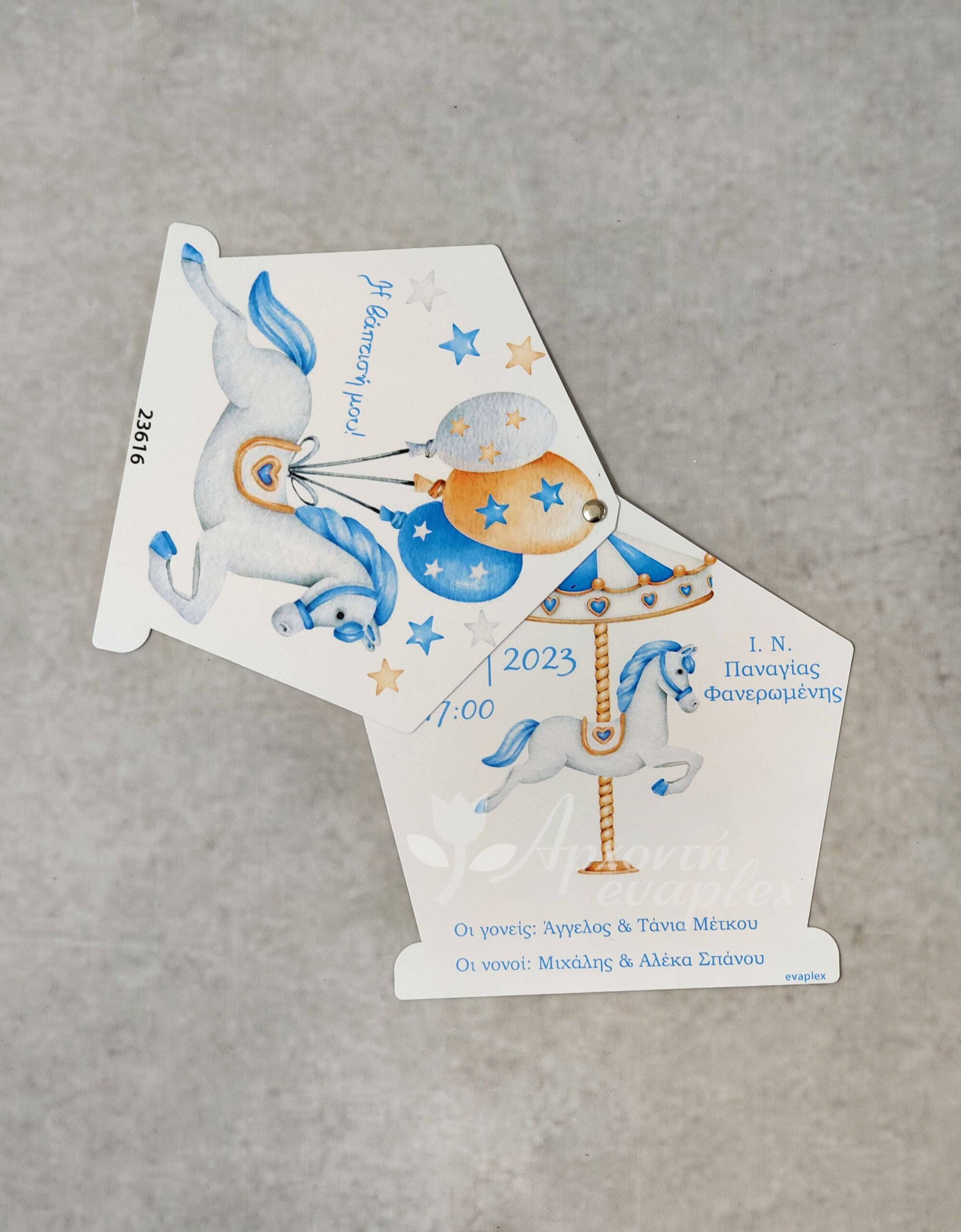 Προσκλητήριο βάπτισης με θέμα Carousel για αγόρι, με διπλή κάρτα και ιδιαίτερο κοπτικό, ενωμένο με τρουξ.
