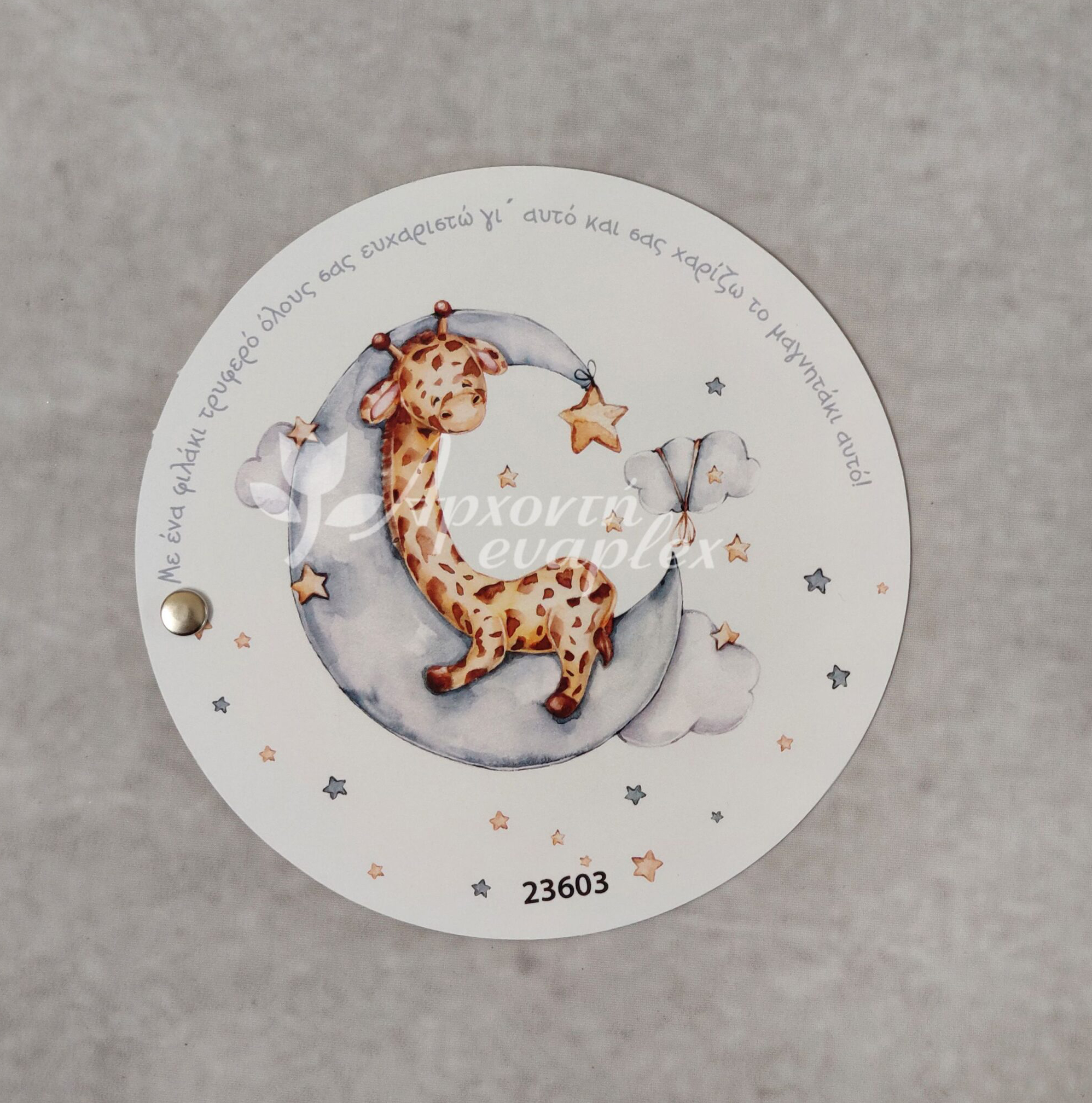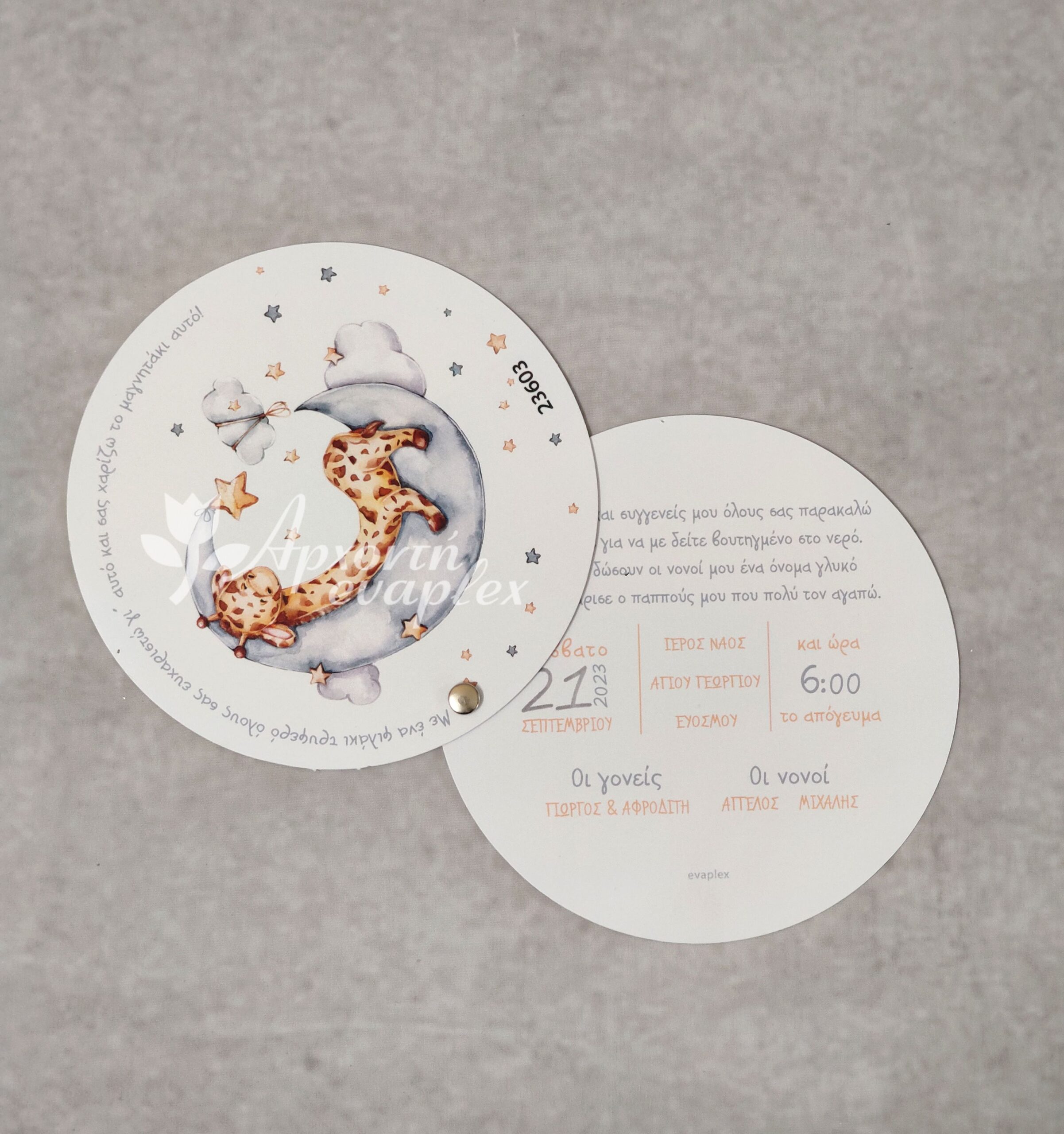 Προσκλητήριο βάπτισης με θέμα καμηλοπάρδαλη και φεγγάρι, με διπλή στρόγγυλη κάρτα, ενωμένο με τρουξ.