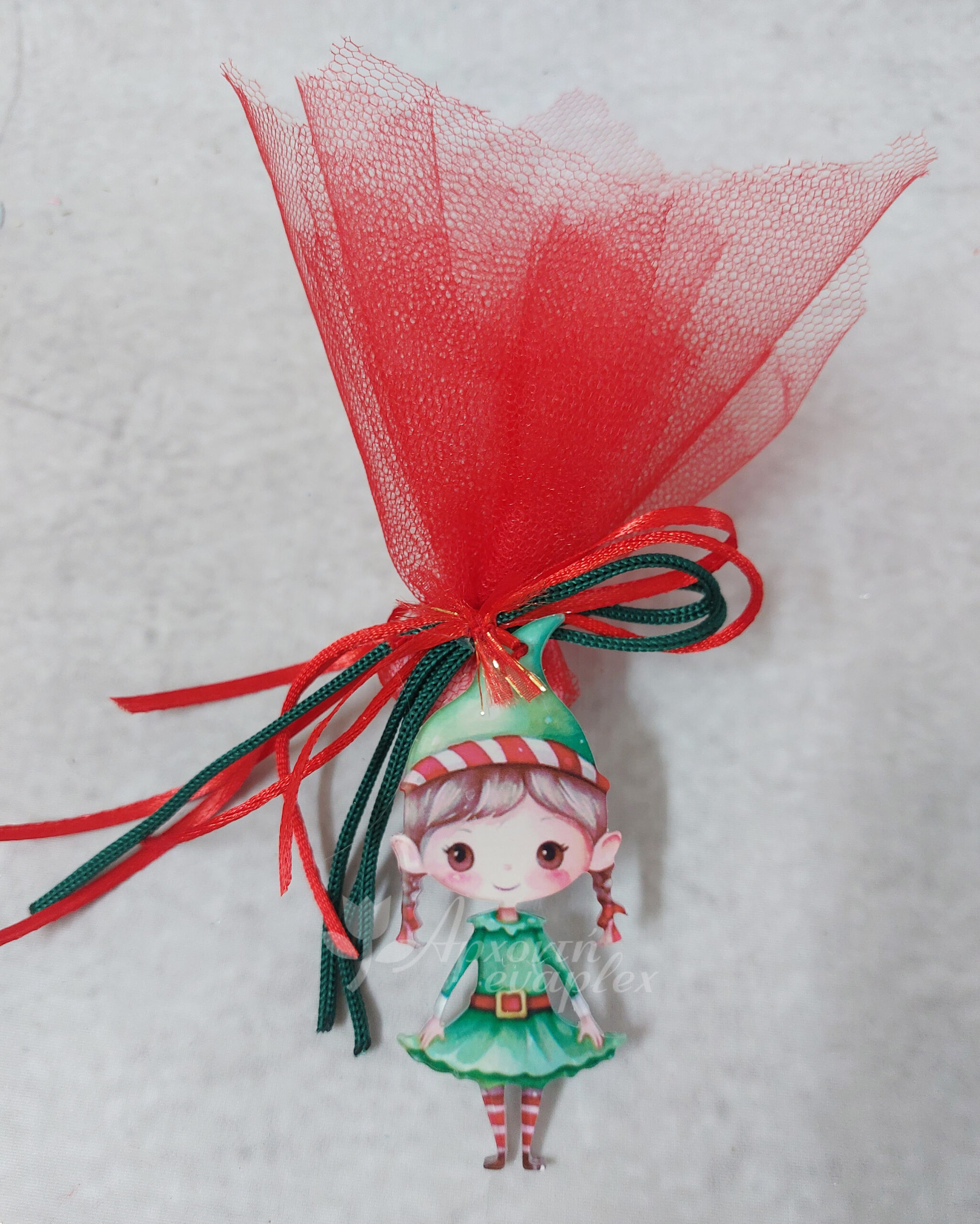 Χριστουγεννιάτικη μπομπονιέρα  plexiglass στολίδι με θέμα ξωτικό δεμένη με δύο πράσινα σχοινάκια, ένα σχοινάκι κόκκινο ποντικοουρά, σατέν κορδέλα, δύο τουλάκια κόκκινα και 5 κουφέτα αμύγδαλο ή 7 κουφέτα smarties.