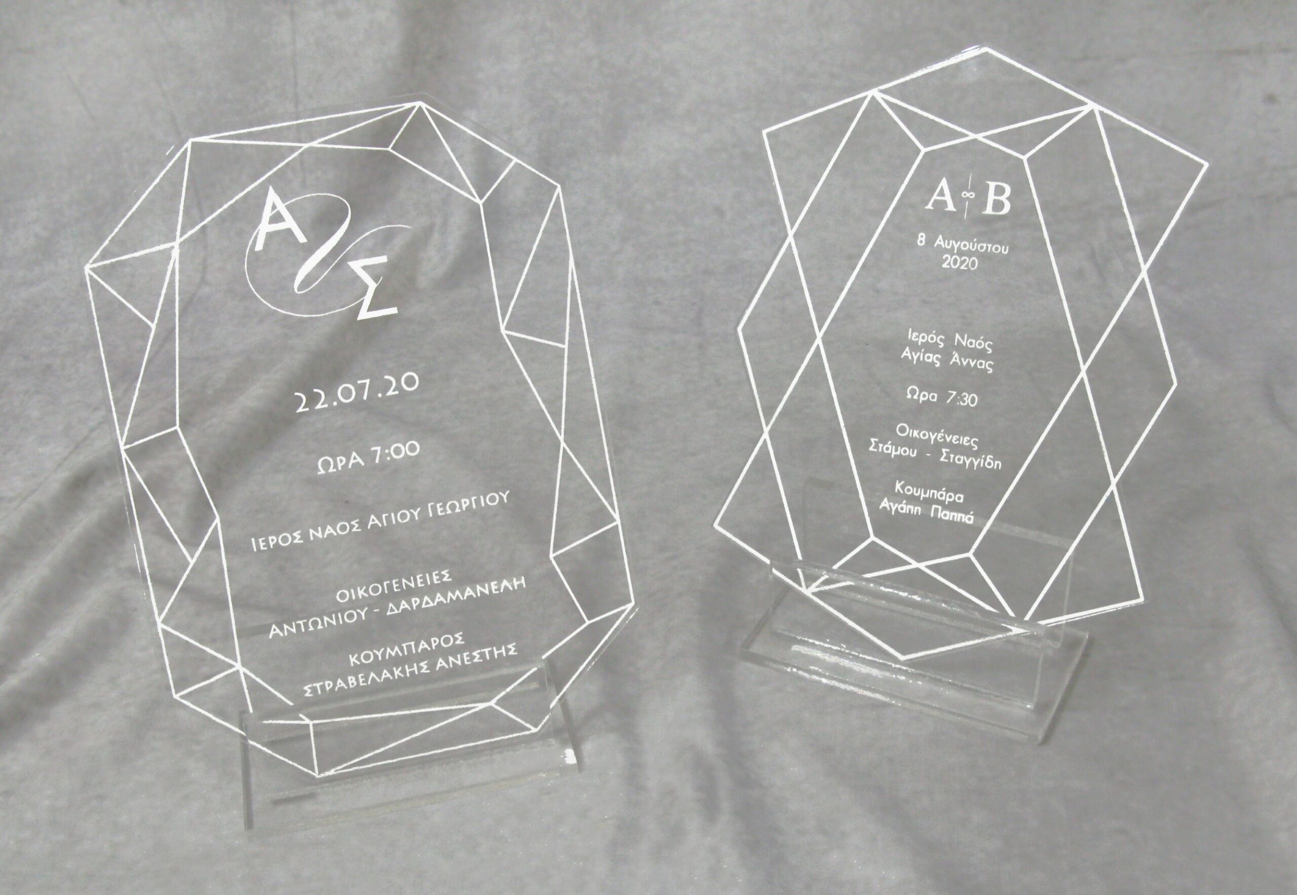 Προσκλητήριο γάμου σε plexi glass σε ιδιαίτερα γεωμετρικά σχήματα, με μεταξοτυπία και φάκελο - κουτί.