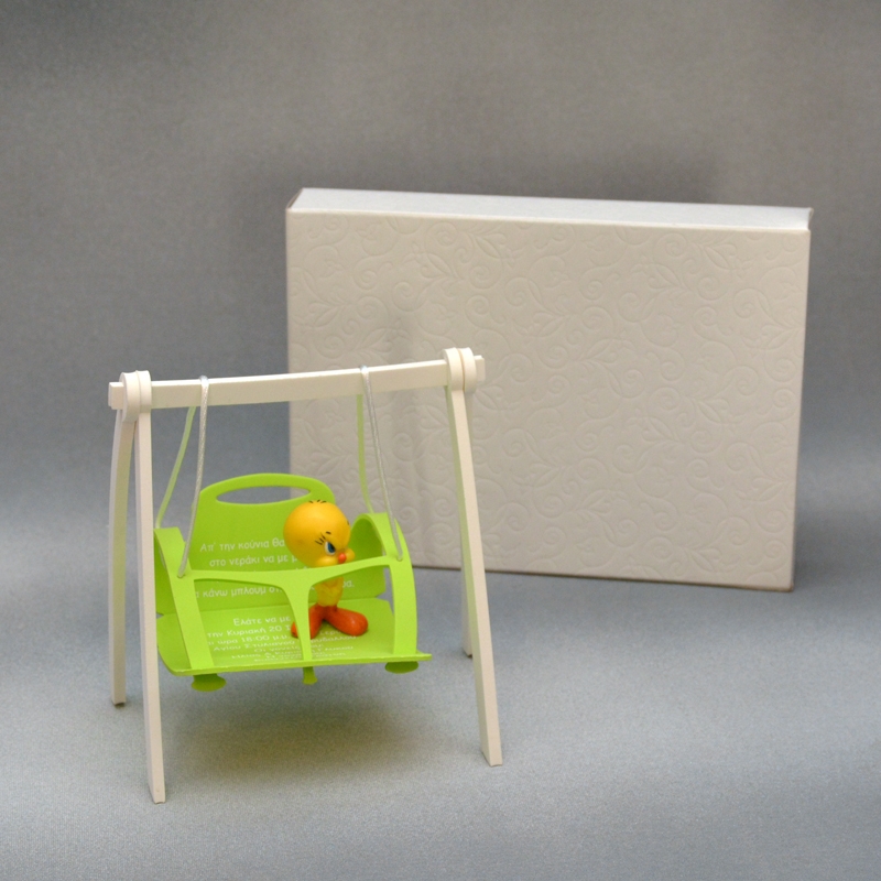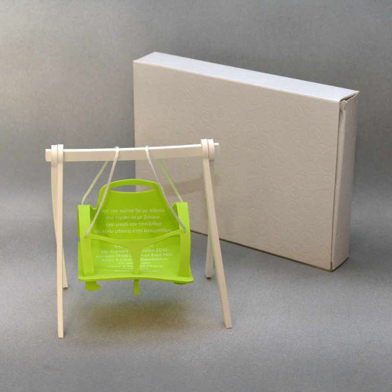 Μοναδικό προσκλητήριο βάπτισης τρισδιάστατη κρεμαστή κούνια σε λαχανί χρώμα, φτιαγμένη από το πατενταρισμένο αφρώδες υλικό EVA foam, με λευκή ποντικοουρά και εκτύπωση μεταξοτυπίας. Συνοδεύεται από ανάγλυφο λευκό κουτί.