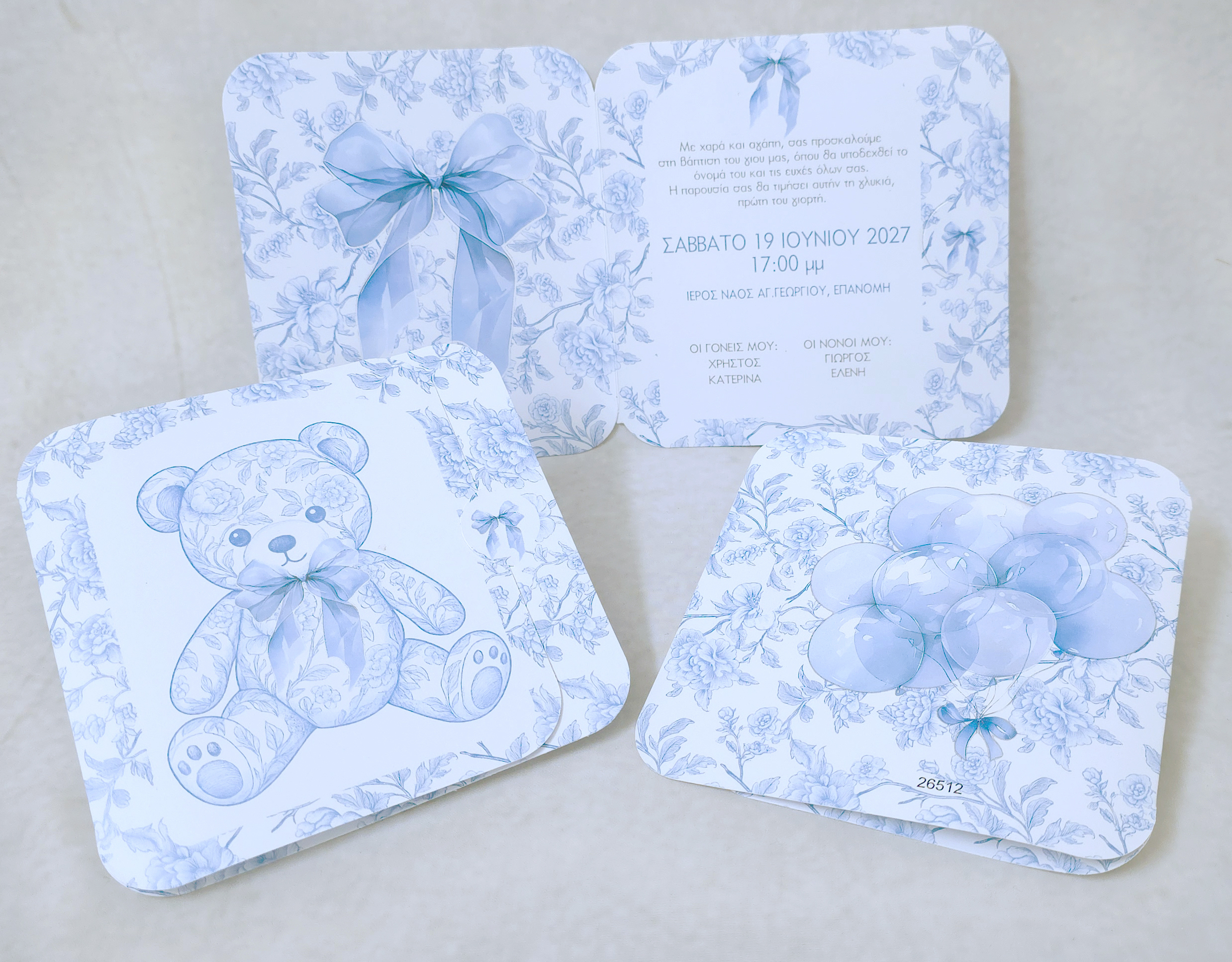 Πρόσκληση δίπτυχο βάπτισης με γλυκό αρκουδάκι και μπαλόνια, σε σχέδιο Toile de Jouy, σε απαλούς γαλάζιους τόνους. Ο παιχνιδιάρικος αλλά κομψός χαρακτήρας της, σε συνδυασμό με τον ιδιαίτερο σχεδιασμό της, δημιουργεί μια τρυφερή και ρομαντική πρόσκληση για μια αξέχαστη βάφτιση.