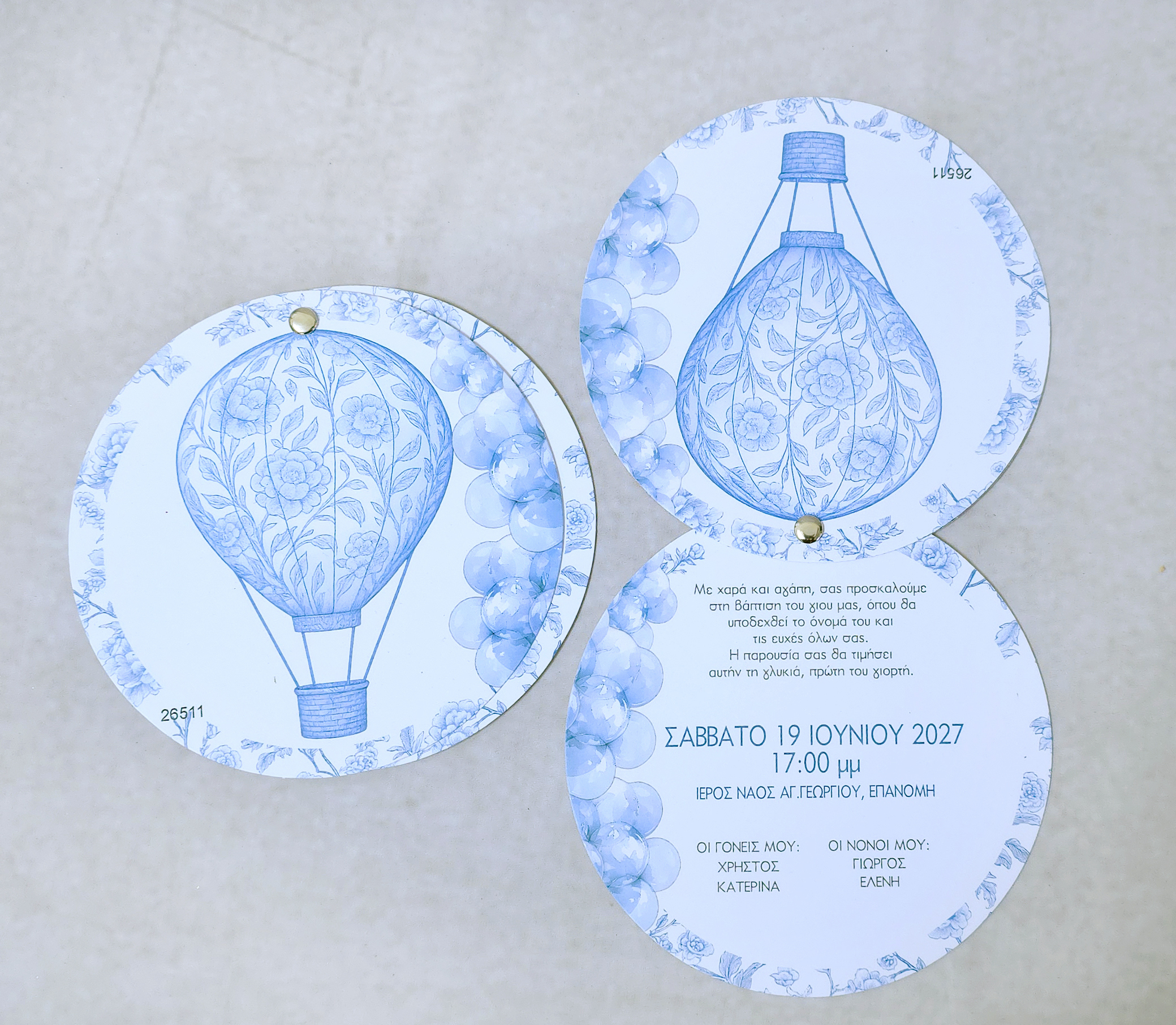 Στρογγυλή πρόσκληση βάπτισης με αέρινο Toile de Jouy σχέδιο σε γαλάζιες αποχρώσεις, διακοσμημένη με ρομαντικό αερόστατο και απαλές λεπτομέρειες. Ο ιδιαίτερος κυκλικός σχεδιασμός της χαρίζει πρωτοτυπία και κομψότητα, δημιουργώντας μια ονειρική και τρυφερή αίσθηση για τη ξεχωριστή αυτή ημέρα.
