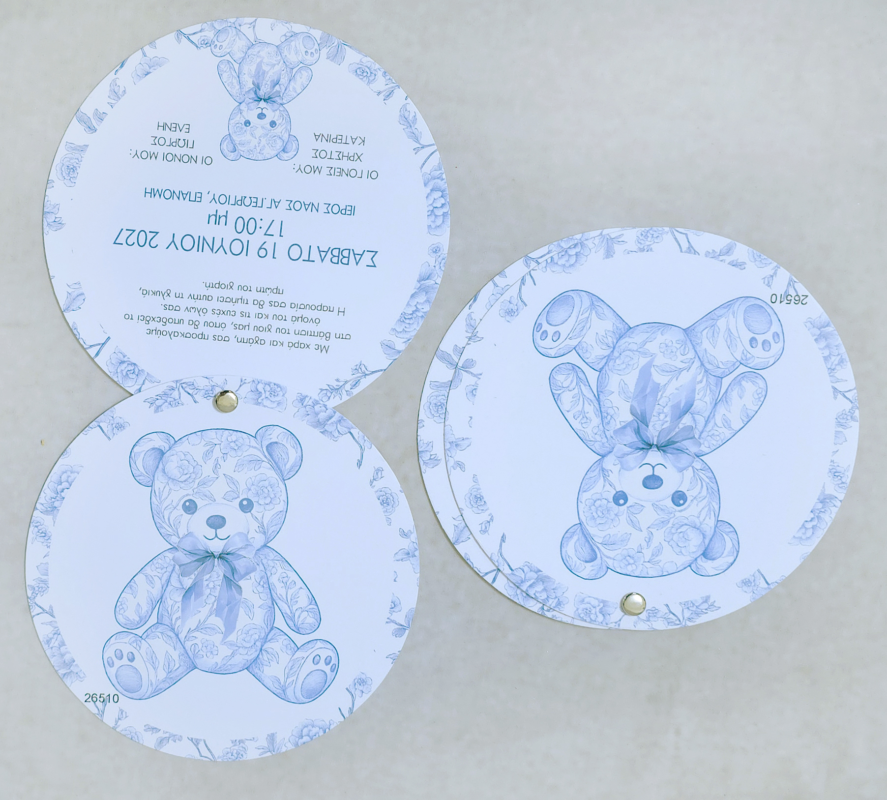 Στρογγυλή πρόσκληση βάπτισης με γλυκό αρκουδάκι, σε σχέδιο Toile de Jouy, σε απαλούς γαλάζιους τόνους. Ο παιχνιδιάρικος αλλά κομψός χαρακτήρας της, σε συνδυασμό με τον ιδιαίτερο κυκλικό σχεδιασμό, δημιουργεί μια τρυφερή και ρομαντική πρόσκληση για μια αξέχαστη βάφτιση.